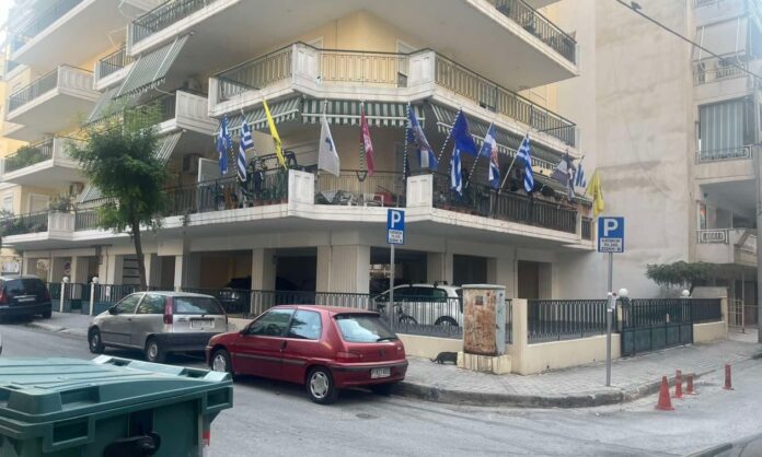 Διεκδικεί ίσως το βραβείο για το πιο σημαιοστολισμένο διαμέρισμα όχι μόνο στη Λάρισα, αλλά σε όλη τη χώρα.
