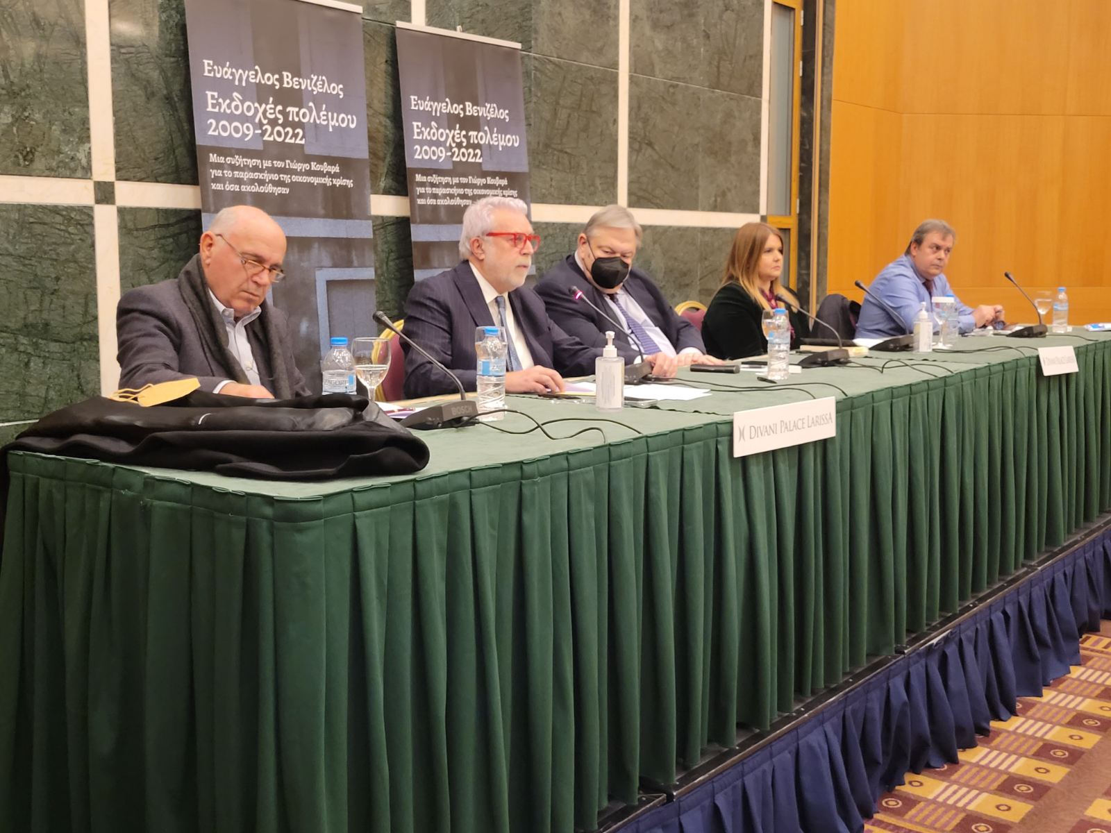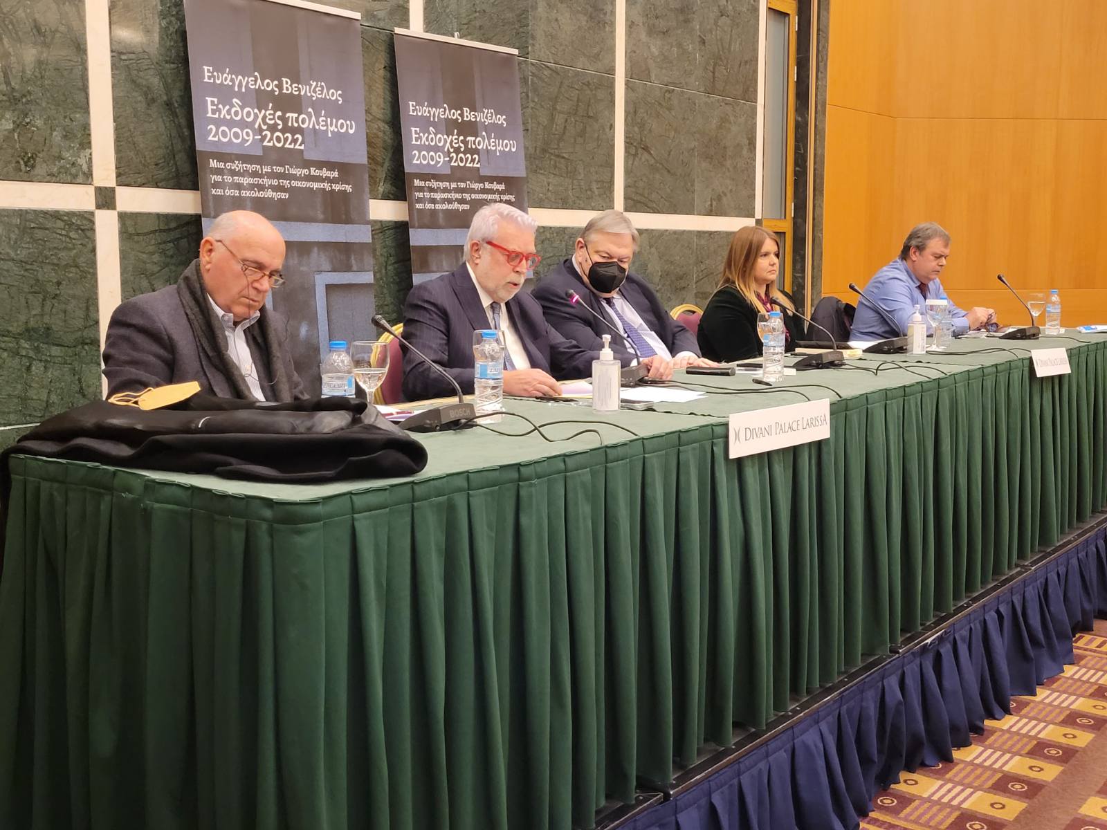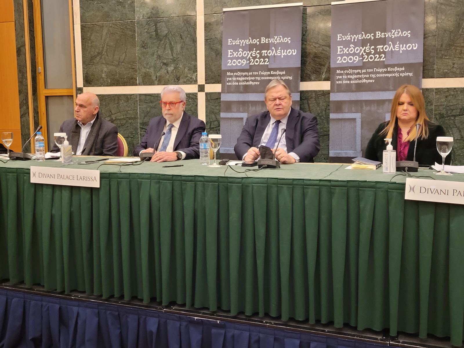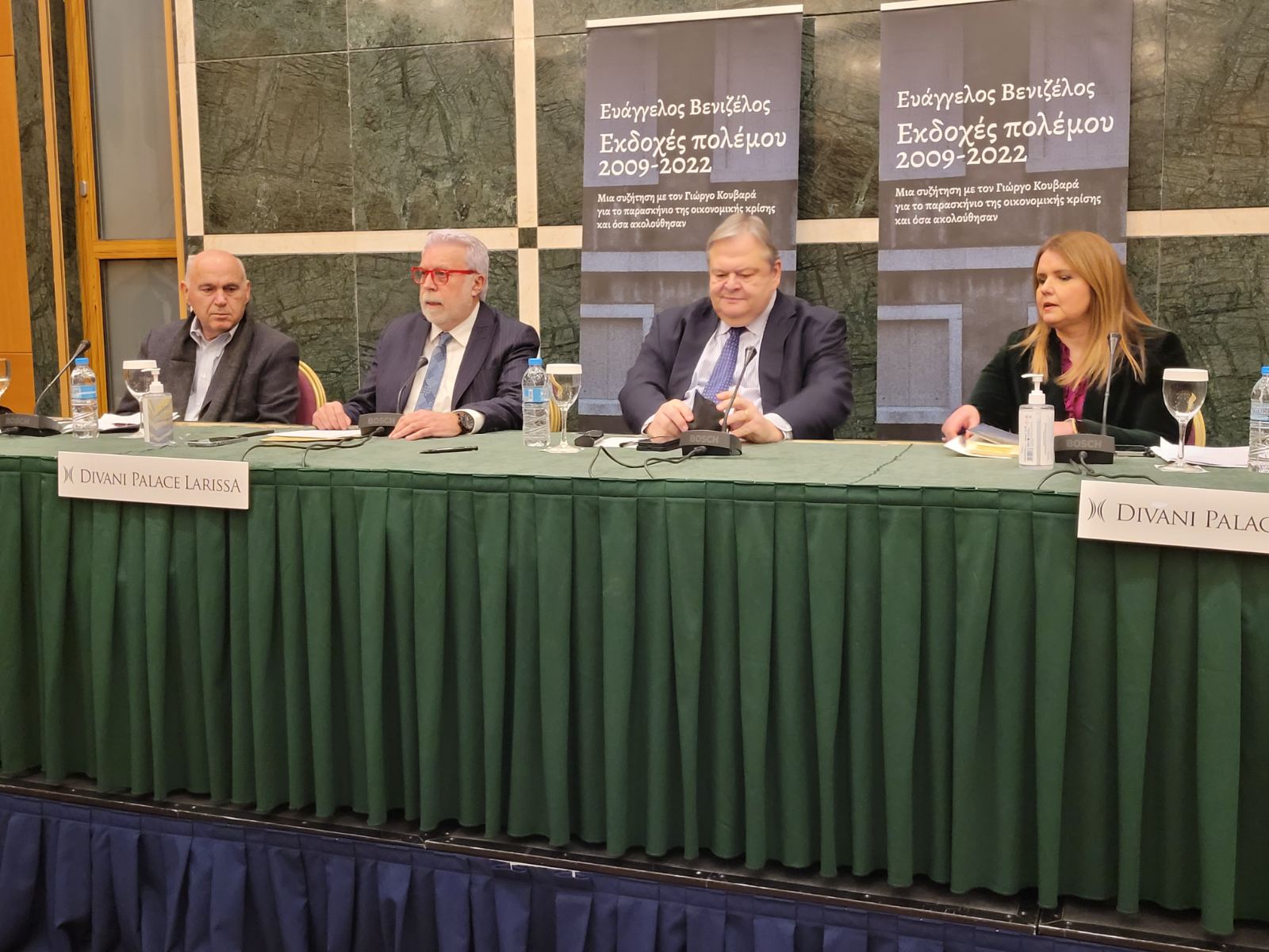 “Η ελληνική κρίση του 2010-2019 ήταν ένα εργαστήριο πάνω στο οποίο δοκιμάστηκαν πάρα πολλά υλικά που τα αξιοποιεί τώρα η Ευρωπαϊκή Ένωση για να αντιμετωπίσει τις νέες κρίσεις” δήλωσε από τη Λάρισα όπου βρέθηκε χθες το απόγευμα ο πρώην υπουργός Ευάγγελος Βενιζέλος, προκειμένου να παρουσιάσει στο κοινό το βιβλίο που συνέγραψε με τίτλο «Εκδοχές πολέμου 2009-2022. Μια συζήτηση με τον Γιώργο Κουβαρά για το παρασκήνιο της οικονομικής κρίσης και όσα ακολούθησαν».