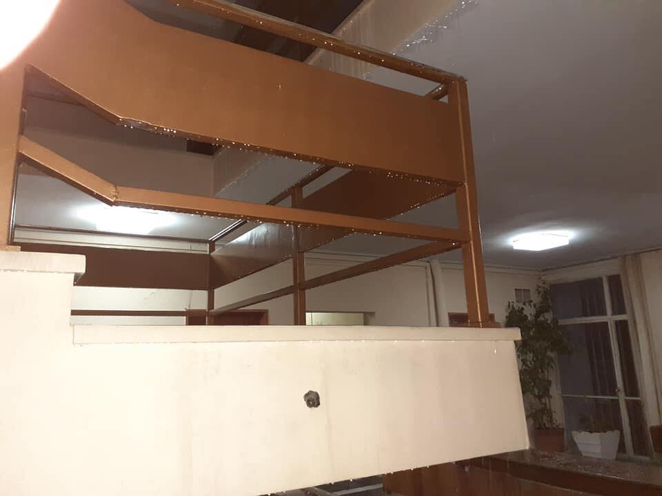 Μια αίθουσα στον τελευταίο όροφο γέμισε νερά από την ταράτσα και εν συνεχεία αυτά πλημμύρισαν τους διαδρόμους και τις σκάλες.