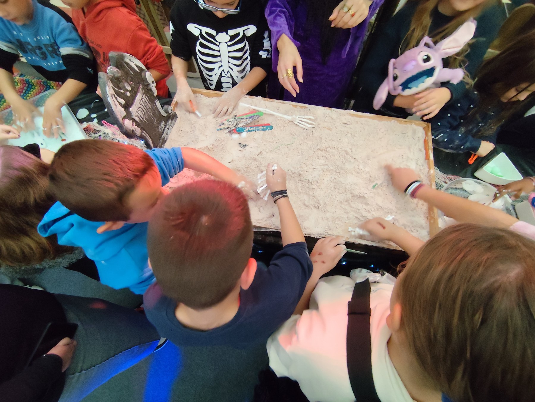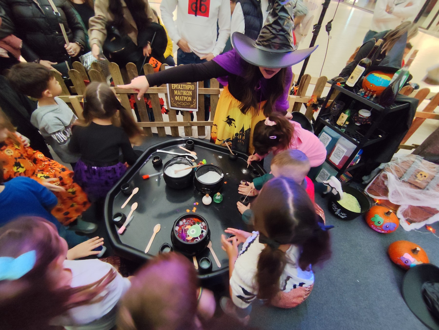 Το απόγευμα, οι δραστηριότητες συνεχίστηκαν με Messy Play & Ξυλοπόδαρο Show, χαρίζοντας στα παιδιά μια ανεπανάληπτη εμπειρία. Μικροί μάγοι και μάγισσες έπλασαν «μαγικά φίλτρα», βούτηξαν τα χέρια τους σε πολύχρωμες «γλίτσες» και «μάτια τεράτων» και δημιούργησαν τις δικές τους Halloween συνταγές γεμάτες φαντασία. Την ίδια στιγμή, ο εντυπωσιακός ξυλοπόδαρος φωτογραφιζόταν με τα παιδιά, σκορπίζοντας γέλιο και χαρά σε κάθε του βήμα.