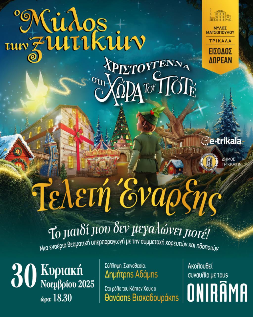 ”Το παιδί που δεν μεγαλώνει ποτέ” τιτλοφορείται η τελετή έναρξης του 14ου Μύλου των Ξωτικών, που για φέτος θα πραγματοποιηθεί την Κυριακή 30 Νοεμβρίου 2025. Η μεγάλη γιορτή των Χριστουγέννων ξεκίνησε και η τελετή έναρξης προσφέρει στους χιλιάδες φίλους και φίλες ένα ξεχωριστό θέαμα, πρωτότυπο και με εκπλήξεις!