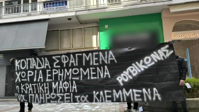Τα μέλη του Ρουβίκωνα σήκωσαν και πανό έξω από το γραφείο του βουλευτή της Νέας Δημοκρατίας, Χρήστου Κέλλα, γράφοντας συνθήματα για τις παράνομες επιδοτήσεις του ΟΠΕΚΕΠΕ αλλά κι για την ευλογιά των αιγοπροβάτων που έχει τσακίσει τους κτηνοτρόφους.