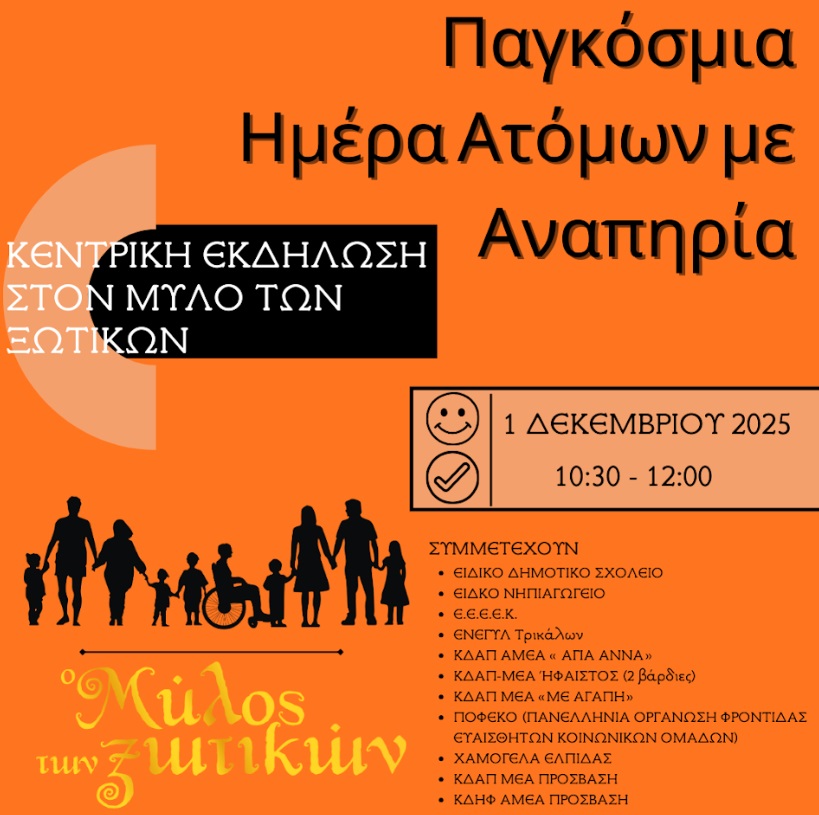 Για τη Δευτέρα 1 Δεκεμβρίου 2025 μεταφέρεται η εκδήλωση του Μύλου των Ξωτικών για την Παγκόσμια Ημέρα ατόμων με Αναπηρία. Όπως τονίζει η οργανωτική επιτροπή, η εκδήλωση που ήταν προγραμματισμένη για την Παρασκευή 28 Νοεμβρίου, αναβάλλεται λόγω δυσμενών καιρικών συνθηκών. Η εκδήλωση θα πραγματοποιηθεί τις ώρες 10.30 έως 12.00.