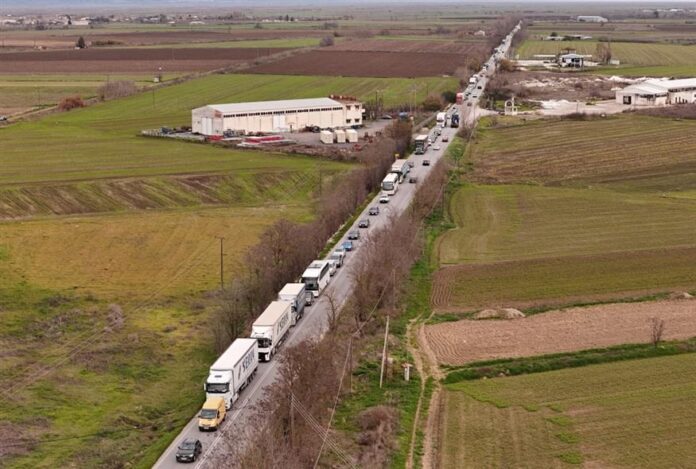 Μετ’ εμποδίων γίνεται η κυκλοφορία στο μπλόκο της Νίκαιας, στη Λάρισα, επί της Εθνικής Οδού Αθηνών Θεσσαλονίκης, καθώς ο δρόμος είναι κλειστός από το ύψος του Νέου Περιβολιού έως τον Πλατύκαμπο.