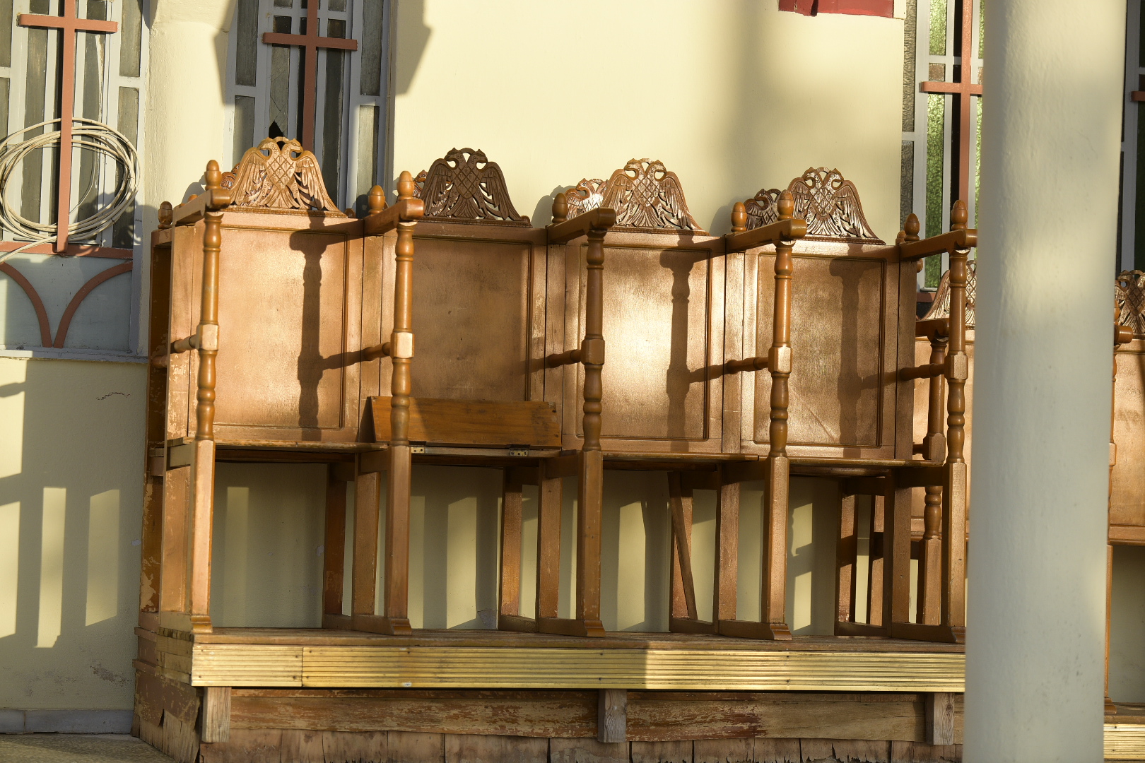 Περιπλανιόμαστε λίγο ακόμα στο χωριό, πριν πάρουμε τον δρόμο της επιστροφής. Τελευταία στάση η εκκλησία, όπου τα στασίδια βρίσκονται στο προαύλιο και “απολαμβάνουν” τον απογευματινό ήλιο, στεγνώνοντας αργά. Προσθέτουν κι αυτά μια ακόμα εικόνα στη γενική ακινησία του τοπίου.