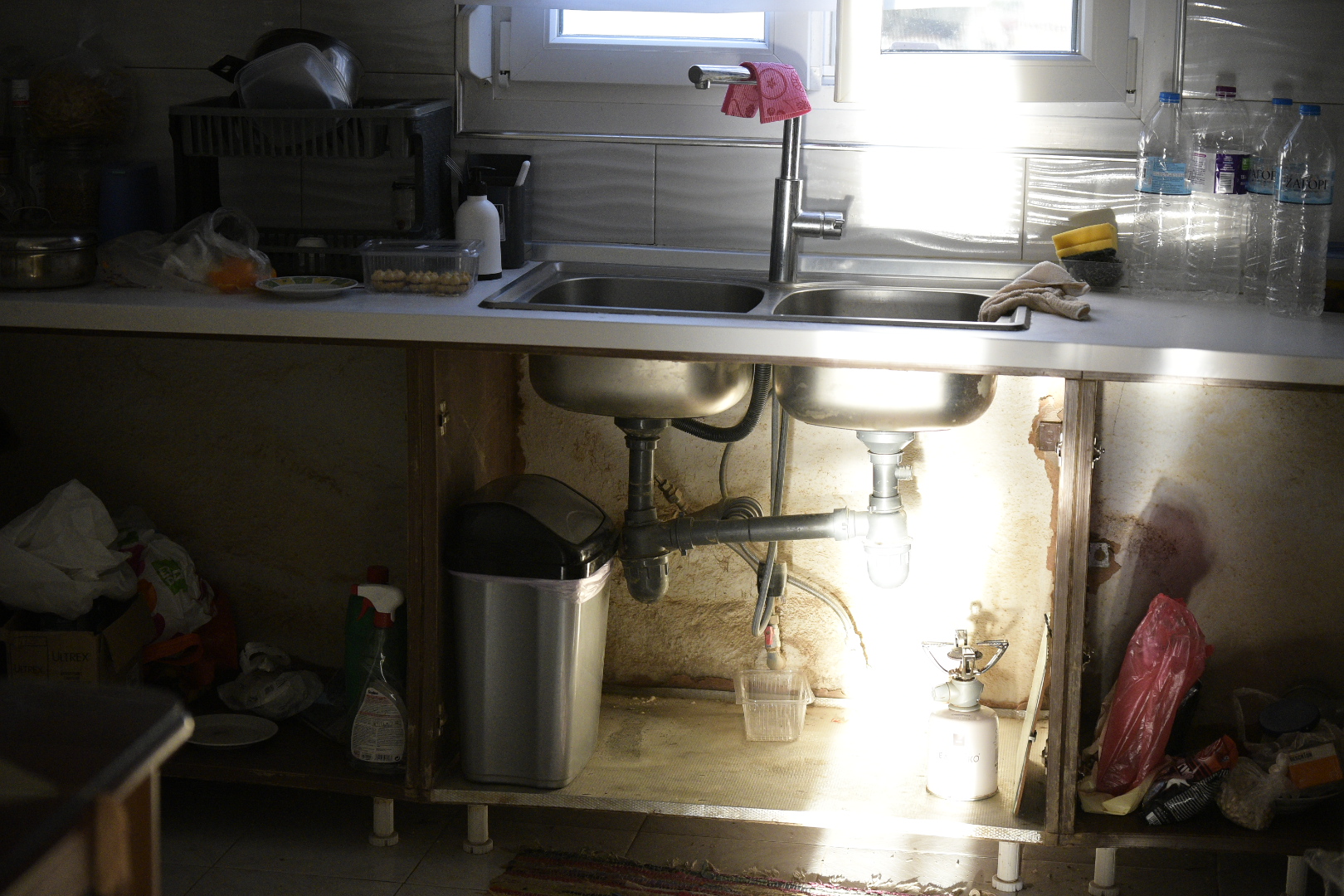«Τα έχουμε πετάξει όλα. Μας έδωσαν κάτι κρεβάτια, που μας τα είχε φέρει ο κ. Καπετάνος με μια άλλη εταιρεία, δωρεά. Αφού έχουμε κι αυτά… Μόνο το μεταλλικό κρεβάτι έμεινε εκεί, χωρίς στρώμα, χωρίς τίποτα. Μετά η κουζίνα από ‘δω είναι χάλια, το νερό ήταν μια πιθαμή πάνω από τον πάγκο, απλώς δεν τα έβγαλα ακόμη, για να μπορώ λίγο να εξυπηρετούμαι, μέχρι να βάλω κάποια βρύση έξω».