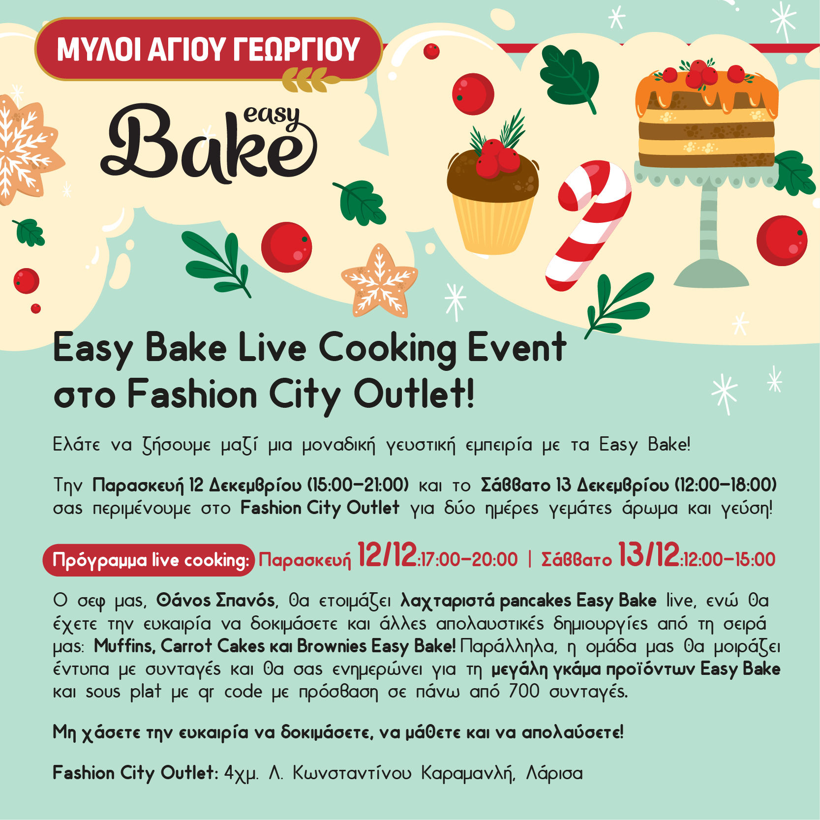 Την Παρασκευή 12 Δεκεμβρίου (17:00–20:00) και το Σάββατο 13 Δεκεμβρίου (12:00–15:00), οι μικροί μας φίλοι μπαίνουν στην πιο νόστιμη χριστουγεννιάτικη δράση με το EasyBake Live Cooking. Ο σεφ του EasyBake από τους Μύλους Αγ. Γεωργίου ετοιμάζει λαχταριστά pancakes επί σκηνής, τα παιδιά δοκιμάζουν γλυκές δημιουργίες EasyBake και παίρνουν μαζί τους ιδέες και έντυπα με συνταγές που μπορούν να απολαύσουν στο σπίτι με όλη την οικογένεια.