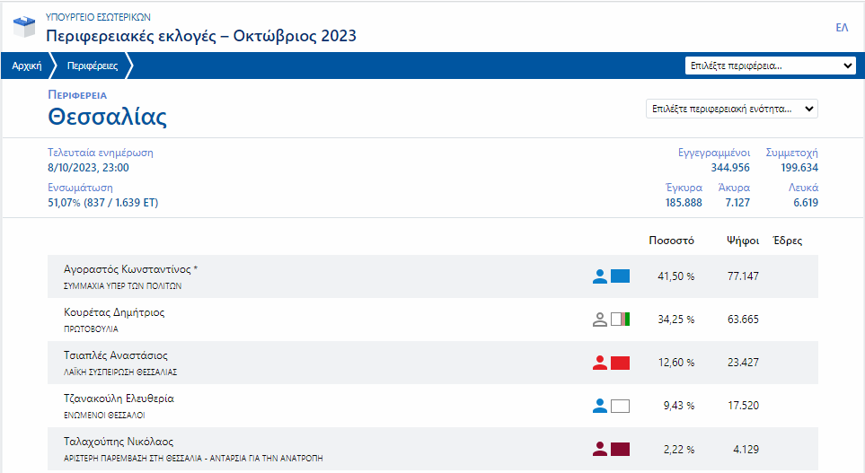 Πάνω από το 50% της ενσωμάτωσης στην Περιφέρεια Θεσσαλίας, ο νυν Περιφερειάρχης Κώστας Αγοραστός προηγείται με 41,50% και ακολουθεί ο Δημήτρης Κουρέτας με 34,25%.