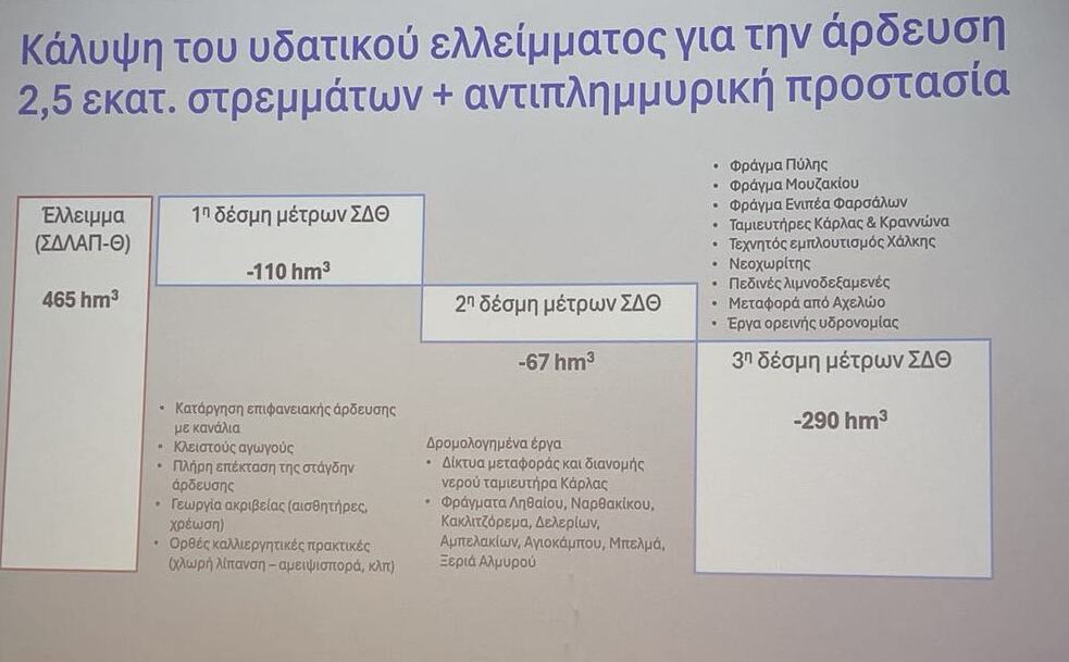 Ο κ. Κουρέτας επεσήμανε πως το πρόγραμμα είναι απόρροια συνεργασίας και σύνθεσης προτάσεων 80 επιστημόνων, ενώ παρουσίασε αναλυτικά στοιχεία για τη φυτική και ζωική παραγωγή αλλά και την κάλυψη του υδατικού ελλείμματος για την άρδευση, αλλά και τη θωράκιση της Θεσσαλίας.