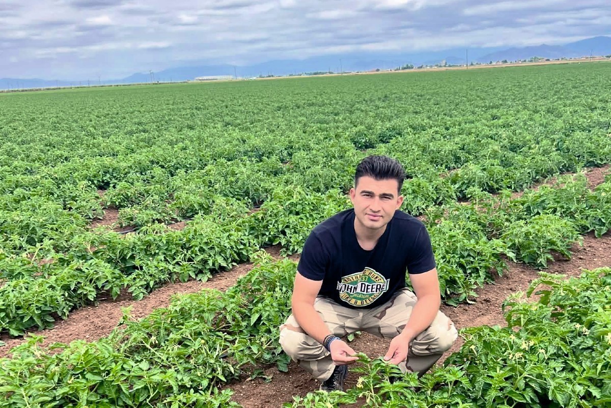 Έχουμε περίπου 3.000 στρέμματα. Ο πατέρας μου καλλιεργεί από το 2004 βιομηχανική ντομάτα. Ο μεγαλύτερος όγκος των καλλιεργειών μας είναι βιομηχανική ντομάτα. Καλλιεργούμε πάρα πολύ σιτάρι σκληρό. Καλλιεργούμε για τον Μπάρμπα Στάθη αρακά και σπανάκι. Λίγα, πολύ λίγα βαμβάκια πλέον με τις εξευτελιστικές τιμές που υπάρχουν. Λίγα ψυχανθή και τα τελευταία χρόνια καλλιεργούμε και φυστίκι Αιγίνης, αυτή τη στιγμή έχουμε φτάσει τα 130 στρέμματα. Είμαστε 8 με 10 που εργαζόμαστε στα στρέμματα μαζί με εμένα και τον πατέρα μου.