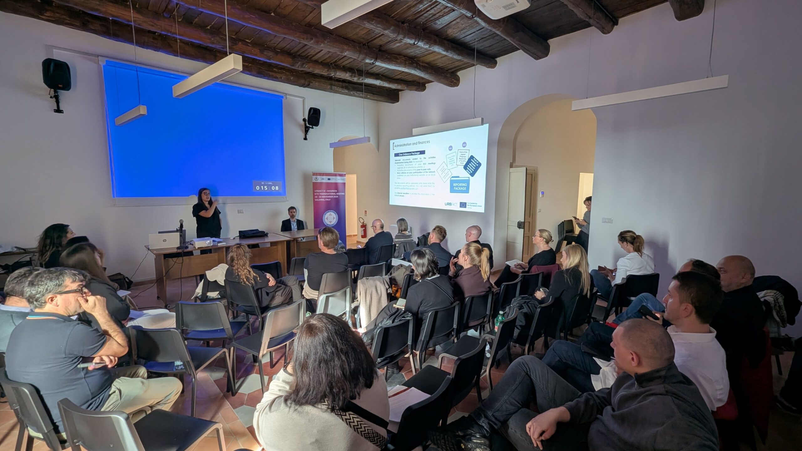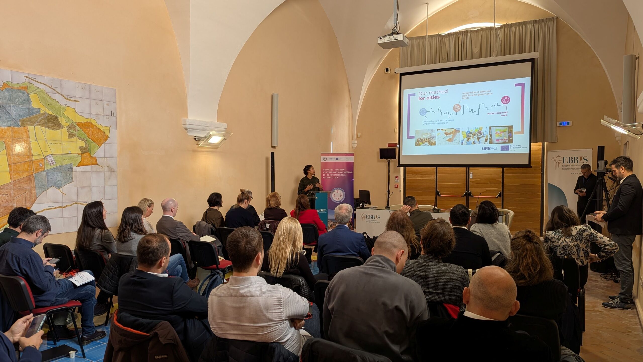 Η έναρξη της τελευταίας συνάντησης του προγράμματος δόθηκε με την επίσημη υποδοχή των εταίρων από τον Δήμο Σαλέρνο στο Palazzo di Città. Κατά τη διάρκεια της πρώτης ημέρας παρουσιάστηκε το πλήρες πρόγραμμα της συνάντησης, ενώ ακολούθησαν θεματικές εισηγήσεις σχετικά με την αειφόρο αστική ανάπτυξη, τον στρατηγικό σχεδιασμό της Περιφέρειας Καμπανίας και τις πρωτοβουλίες αστικής αναγέννησης της πόλης. Στο πλαίσιο της ενότητας «In4Green results: stories from 10 Cities», παρουσιάστηκαν από όλους τους εταίρους τα ολοκληρωμένα Σχέδια Ολοκληρωμένων Δράσεων (IAPs), τα οποία αποτελούν το τελικό και βασικό παραδοτέο του προγράμματος για κάθε συμμετέχουσα πόλη.