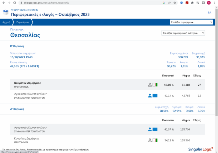 Στο 47,16 (773 / 1.639 ΕΤ) των εκλογικών τμημάτων ο Δ. Κουρέτας προηγείται σταθερά λαμβάνοντας: Κουρέτας Δημήτριος ΠΡΩΤΟΒΟΥΛΙΑ 58,86 , ψήφοι 61.183 και έδρες 27 και ο Αγοραστός Κωνσταντίνος “ΣΥΜΜΑΧΙΑ ΥΠΕΡ ΤΩΝ ΠΟΛΙΤΩΝ”, ποσοστό 41,14 %, ψήφοι 42.765 και 12 έδρες.
