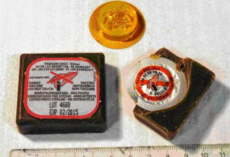 1. Να μην αγγίζουν το εμβόλιο – δόλωμα. Αν κατά την διάρκεια οποιασδήποτε δραστηριότητας (περιπάτου, εκδρομής, άθλησης ή κυνηγιού), αναγνωρίσουν το εμβόλιο – δόλωμα (στον δρόμο, στην εξοχή, στο χωράφι ή σε κατοικημένη περιοχή), να μην έρθουν σε επαφή με αυτό με γυμνά χέρια. Αν το εμβόλιο δεν είναι κατεστραμμένο, να πιάσουν το δόλωμα με ένα γάντι ή πλαστική σακούλα και να το προσκομίσουν στην πλησιέστερη κτηνιατρική υπηρεσία ή να το μεταφέρουν σε μη κατοικημένη περιοχή (δάσος, χωράφι), ώστε να μην έρθει άλλος σε επαφή με αυτό. Αν η πλαστική κάψουλα που περιέχει το υγρό εμβόλιο είναι άθικτη, δεν υπάρχει κανένας κίνδυνος μόλυνσης, ακόμη και αν το εξωτερικό περίβλημα είναι κατεστραμμένο. Παρόλα αυτά συνιστάται να μην το πιάσουν με γυμνά χέρια.