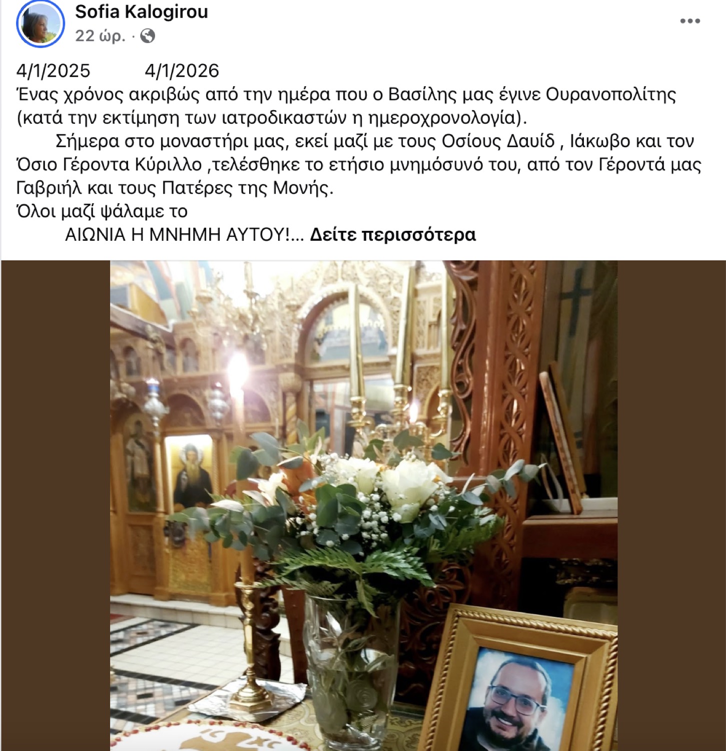 Η επέτειος τιμήθηκε με μεγάλη συγκίνηση προχθές Κυριακή στο μοναστήρι όπου ο αδικοχαμένος Λαρισαίος Βασίλης Καλογήρου – η υπόθεση του οποίου είχε συγκλονίσει όλη την Ελλάδα- «βρήκε πνευματική γαλήνη, ανάμεσα στους Οσίους Δαυίδ, Ιάκωβο και τον Όσιο Γέροντα Κύριλλο», σύμφωνα με την ανάρτηση της μητέρας του Σοφίας Καλογηρου – Αποστολάκη, γνωστή πρώην εισαγγελέα της Λάρισας.