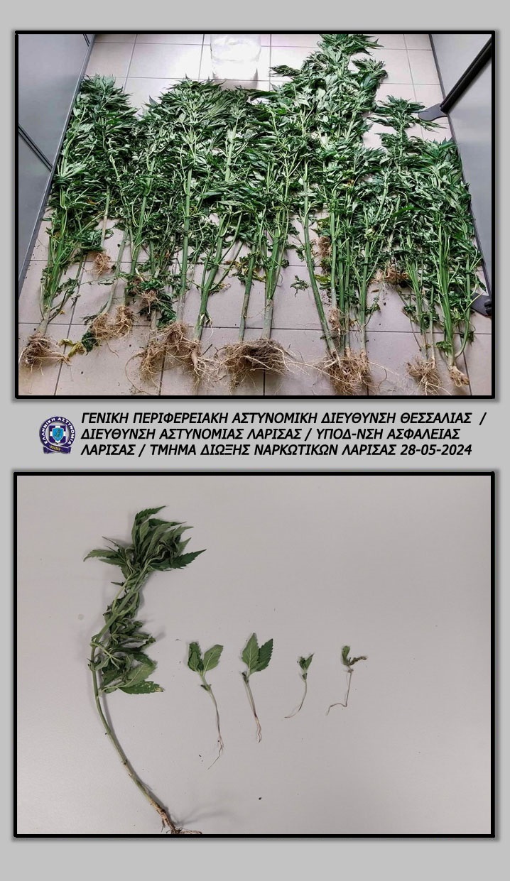 Ειδικότερα, ύστερα από κατάλληλη αξιοποίηση στοιχείων για καλλιέργεια δενδρυλλίων κάνναβης από τον δράστη σε περιοχή του Δήμου Τεμπών, από τους αστυνομικούς εντοπίστηκαν -2- φυτείες δενδρυλλίων κάνναβης, η μεν πρώτη αποτελούμενη από -21- καλλιεργούμενα δενδρύλλια κάνναβης, ύψους από -1,2- έως -2- μέτρα και η δεύτερη από -5- καλλιεργούμενα φυτά-δενδρύλλια κάνναβης, ύψους από -7- έως -30- εκατοστά, τα οποία εκριζώθηκαν και κατασχέθηκαν.