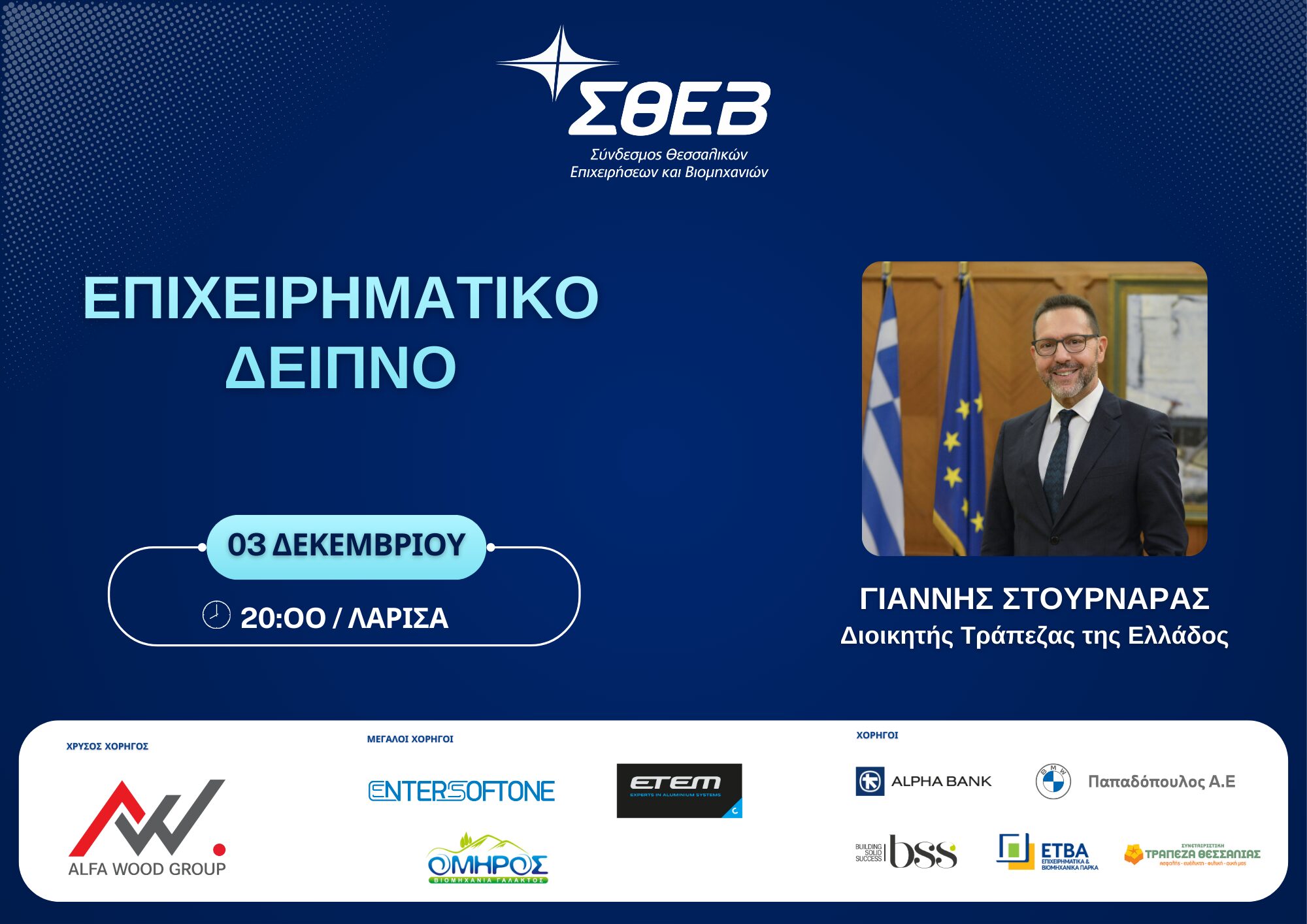 Στη Λάρισα θα βρεθεί αύριο, Τετάρτη ο Διοικητής της Τράπεζας της Ελλάδος κ. Γιάννης Στουρνάρας, ο οποίος θα παρευρεθεί σε επιχειρηματικό δείπνο των μελών του ΣΘΕΒ στο Ξενοδοχείο Grecotel Larissa Imperial.
