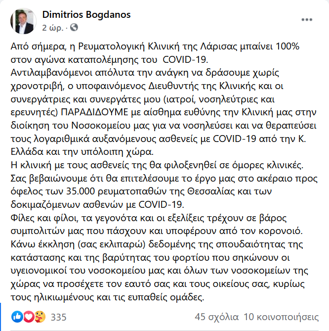 Ο κ. Μπόγδανος – με ανάρτησή του στα μέσα κοινωνικής δικτύωσης – ανακοινώνει ότι παραδίδει την Κλινική που διευθύνει στη διοίκηση του Πανεπιστημιακού Νοσοκομείου Λάρισας ώστε να νοσηλευτούν και εκεί οι ασθενείς που νοσούν από κορωνοϊό.