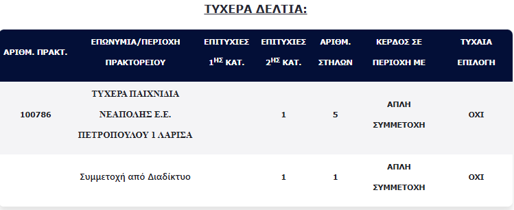 Επίσης, δύο (2) τυχερά δελτία βρέθηκαν στη 2η κατηγορία (5), τα οποία κερδίζουν το ποσό των €100.000,00 για κάθε επιτυχία.