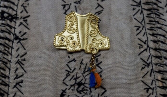 Μια καρφίτσα εμπνευσμένη από το γυναικείο γιλέκι της Καραγκούνας στα Μεγάλα Καλύβια Τρικάλων, με το χαρακτηριστικό του επίρραπτο κέντημα τερζήδικης τεχνικής.