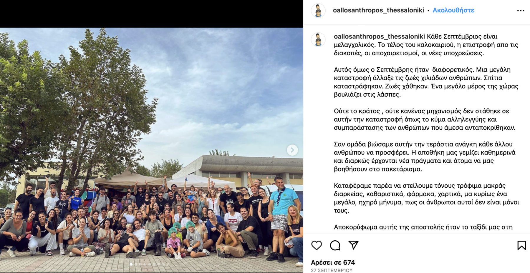Πρόκειται για μια πρωτοβουλία από την ομάδα «Ο Άλλος Άνθρωπος». Το κάλεσμα έγινε μέσω των social media, όπου ζητήθηκε η συνδρομή εθελοντών, προκειμένου να μεταβούν από τη Θεσσαλονίκη στη Λάρισα και να συνδράμουν σε πολίτες, με προτεραιότητα αυτούς που δεν έχουν άλλη βοήθεια από συγγενείς και φίλους. Μέσα σε λίγες μόλις ώρες, υπερκαλύφθηκαν οι θέσεις των εθελοντών και ένα λεωφορείο ξεκίνησε από τη Θεσσαλονίκη για τις πληγείσες περιοχές.