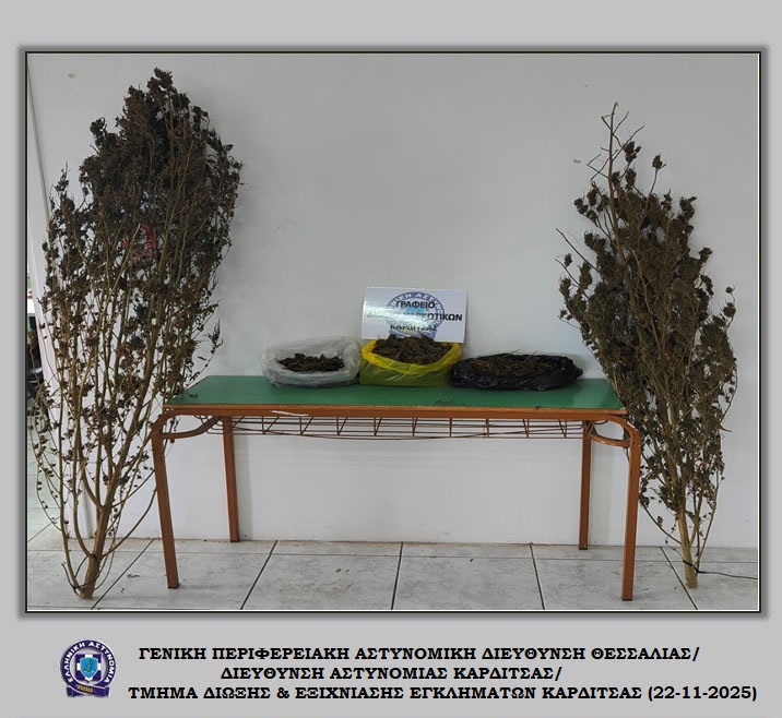 Συνελήφθη, χθες (21-11-2025) το πρωίσε περιοχή του Δήμου Παλαμά της Περιφερειακής Ενότητας Καρδίτσας, απόαστυνομικούςτου Τμήματος Δίωξης και Εξιχνίασης Εγκλημάτων Καρδίτσας, ένας ημεδαπός άνδρας, σε βάρος του οποίου σχηματίστηκε δικογραφίαγια παραβάσεις της νομοθεσίας περί ναρκωτικών.