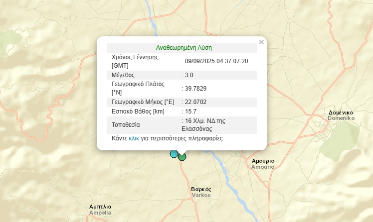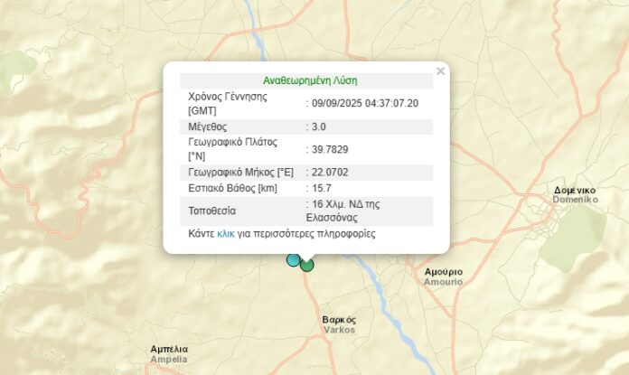 Στις 7:52πμ 1,6 Ρίχτερ 16 χλμ Νοτιοδυτικά της Ελασσόνας και εστιακό βάθος 12.9χλμ.