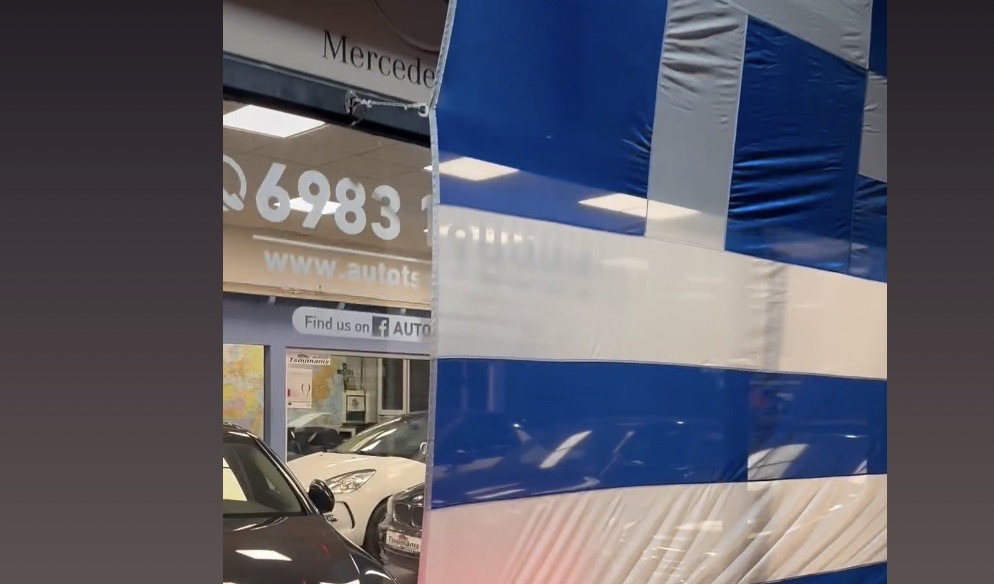 Ένα θέαμα εντυπωσιακό με την τεράστια γαλανόλευκη να καλύπτει όλη την πρόσοψη του καταστήματος και φυσικά να έλκει όλα τα βλέμματα των περαστικών.