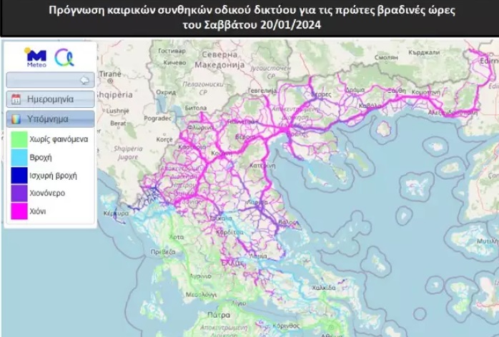 Οι συνθήκες στο οδικό δίκτυο που θα επικρατήσουν τις πρώτες βραδινές ώρες του Σαββάτου θα είναι δύσκολες. Όπως φαίνεται στον χάρτη, χιονοπτώσεις αναμένονται στο μεγαλύτερο μέρος του οδικού δικτύου της Μακεδονίας, της Θράκης και της Θεσσαλίας καθώς σε τμήματα της Ηπείρου και της Στερεάς.