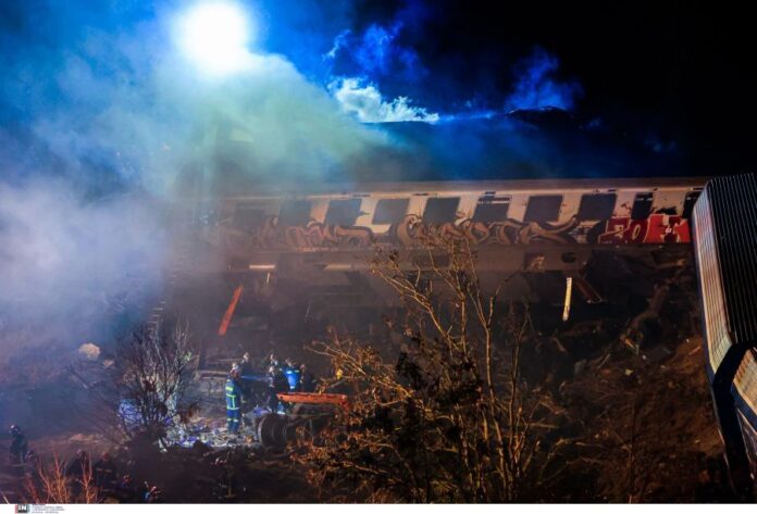 Το βράδυ της 28ης Φεβρουαρίου 2023 οι δύο αμαξοστοιχίες έρχονται σε μια τρομερή μετωπική σύγκρουση. Για αρκετή ώρα στα συντρίμμια των βαγονιών υπάρχουν μικρές εστίες φωτιάς με τα μηχανήματα της Πυροσβεστικής να λειτουργούν συνεχώς για την κατάσβεσή τους.