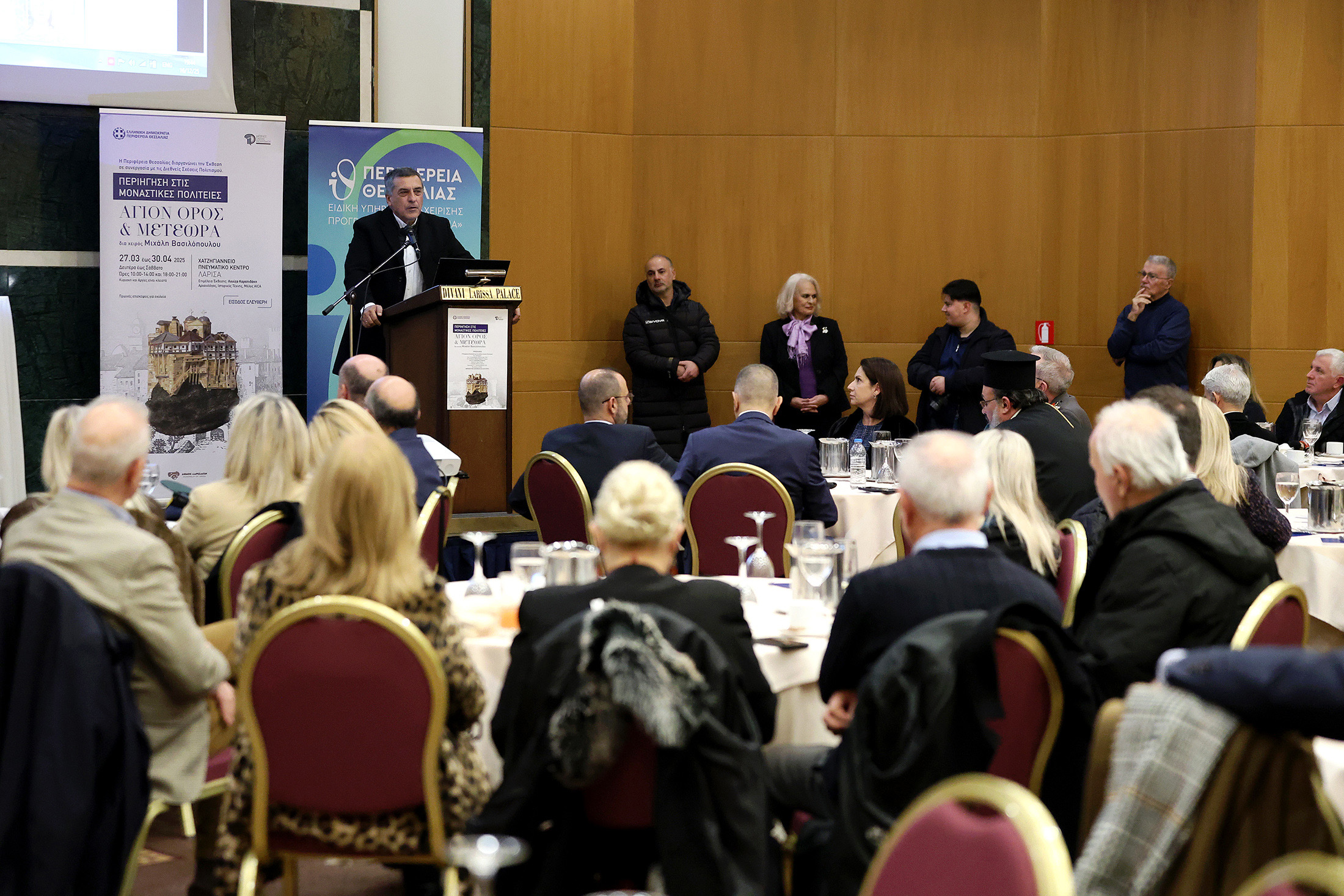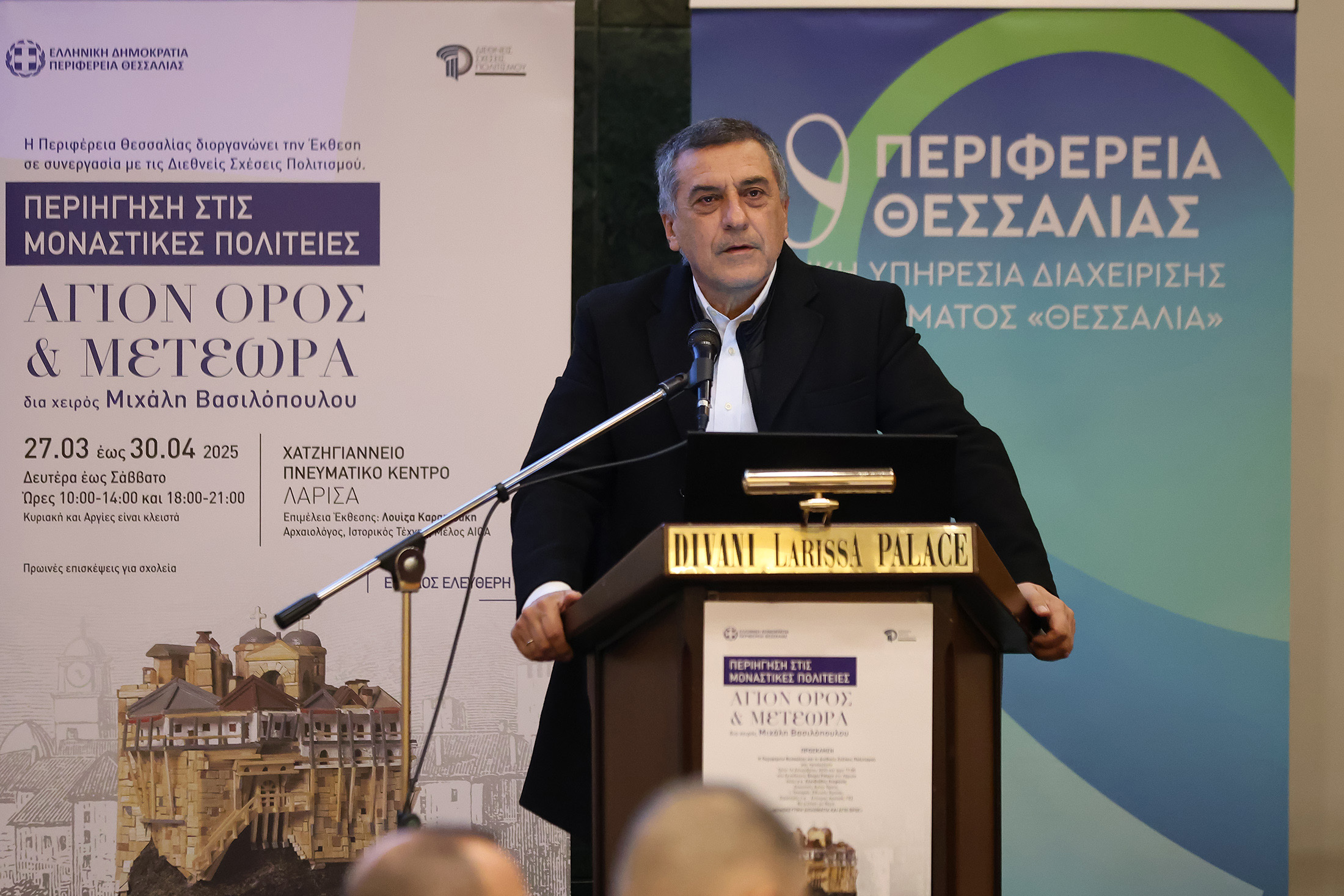 Με μια εκδήλωση ιδιαίτερης σημασίας ολοκληρώθηκε ο κύκλος των παράλληλων δράσεων της Έκθεσης «Περιήγηση στις Μοναστικές Πολιτείες – Άγιον Όρος & Μετέωρα», η οποία παρουσιάστηκε με μεγάλη επιτυχία στη Λάρισα. Η Περιφέρεια Θεσσαλίας, σε συνεργασία με τις Διεθνείς Σχέσεις Πολιτισμού, διοργάνωσε το βράδυ της Τρίτης στο ξενοδοχείο DivaniPalace την τελική εκδήλωση, με κεντρικό ομιλητή τον κ. Αλκιβιάδη Στεφανή, Διοικητή του Αγίου Όρους, τ. Υπουργό Εθνικής Άμυνας, Στρατηγό ε.α. και Επίτιμο Αρχηγό ΓΕΣ, ο οποίος ανέπτυξε το θέμα: «Θρησκευτική διπλωματία και Άγιο Όρος». Ανοίγοντας την εκδήλωση, ο Περιφερειάρχης Θεσσαλίας κ. Δημήτρης Κουρέτας επισήμανε ότι «η αγιορείτικη ζωή αποτελεί τον πυρήνα της Ορθοδοξίας». Τόνισε πως, πέρα από την αφοσίωση στον Θεό, προβάλλονται πανανθρώπινες αξίες, όπως ο λιτός τρόπος ζωής, η διατροφή και η απόσυρση από πράγματα που δεν έχουν ουσιαστικό ενδιαφέρον, υπογραμμίζοντας ότι το Άγιο Όρος μπορεί να λειτουργεί διαχρονικά ως παράδειγμα. Πρόσθεσε, μάλιστα, ότι ως καθηγητής έχει μελετήσει ιδιαίτερα το ζήτημα της νηστείας και της αγιορείτικης διατροφής. Ο Περιφερειάρχης σημείωσε επίσης ότι αυτή η προσέγγιση στο Άγιο Όρος θα αποτελέσει αντικείμενο και του δεύτερου κύκλου εκδηλώσεων, ο οποίος θα ξεκινήσει με τη νέα χρονιά.