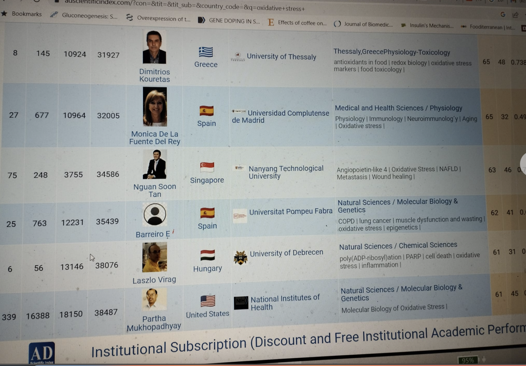 «Στην κατάταξη του World scientist ranking 2023 στο πεδίο του oxidative stress (οξειδωτικό στρες), 9ος στις ευρωπαϊκές χώρες , 31ος παγκοσμίως, 1ος στην Ελλάδα. Με h index στο πεδίο, 65. Άντε και του χρόνου πιο καλά», ανέφερε ο ίδιος ο Καθηγητής του Τμήματος Βιοχημείας -Βιοτεχνολογίας του Πανεπιστημίου Θεσσαλίας, αναρτώντας τον πίνακα με τη λίστα.