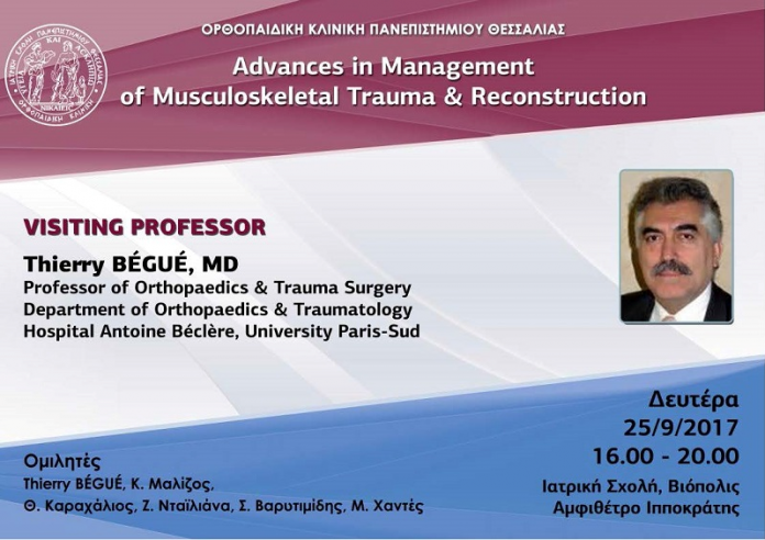 Η Ορθοπαιδική κλινική του Πανεπιστημίου Θεσσαλίας έχει την τιμή να φιλοξενεί τον Καθηγητή Ορθοπαιδικής Thierry Begue του Πανεπιστημίου του Παρισιού. Ο Prof. Thierry Begue θα βρίσκεται στη Λάρισα τη Δευτέρα 25/9/2017 και θα συμμετάσχει στην Εσπερίδα με θέμα «Advances in Management of Musculoskeletal Trauma & Reconstruction», η οποία θα πραγματοποιηθεί στο μεγάλο αμφιθέατρο «Ιπποκράτης» της Ιατρικής Σχολής, στη Βιόπολη Λάρισας, τη Δευτέρα 25/9/2017 και ώρα 16.00-20.00.