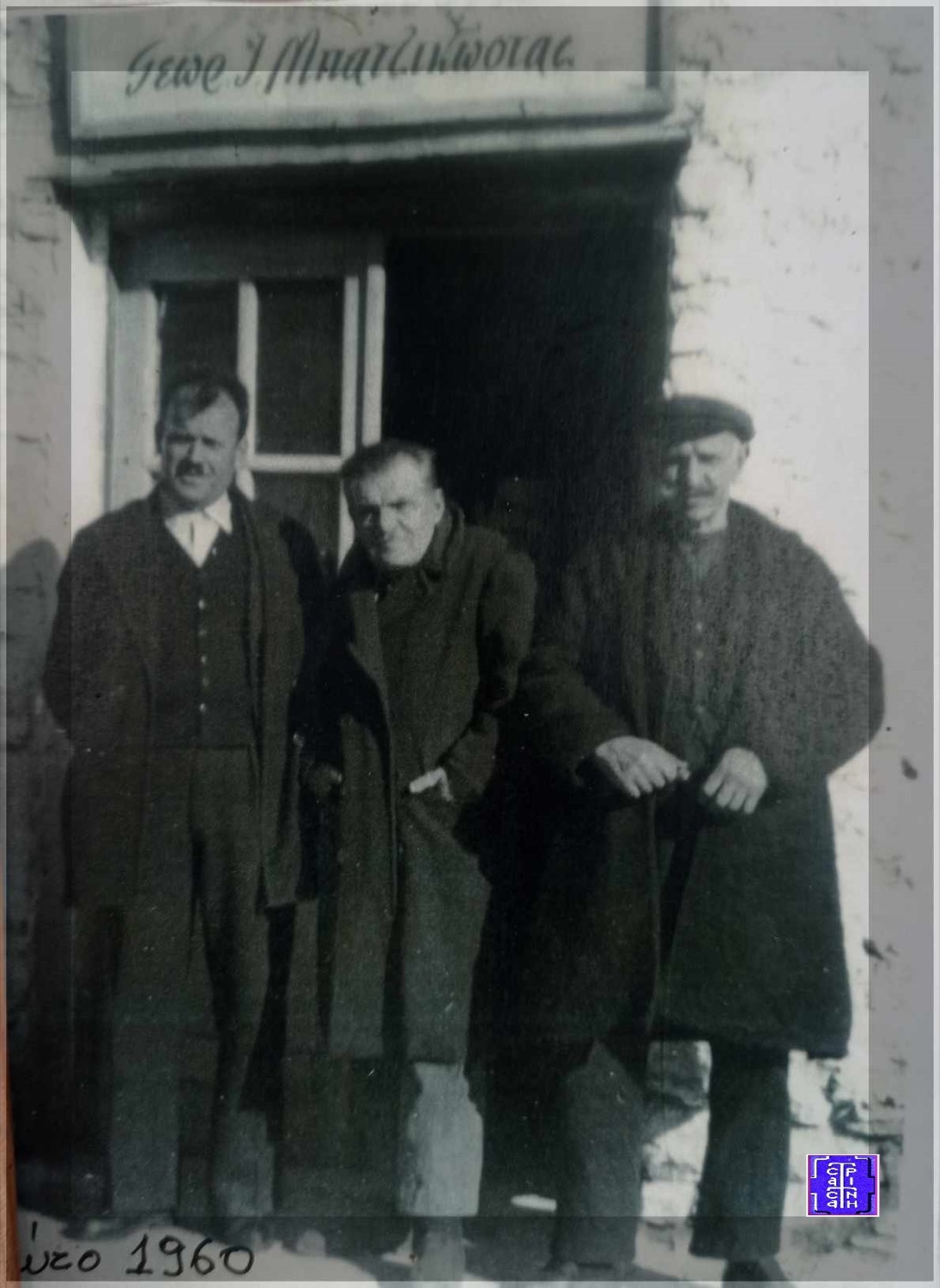 Η επιγραφή πάνω τους αναγράφει με καλλιγραφική γραφή ” Γεωργ. Ι. Μπατζικώστας “. Επρόκειτο για ένα μικρό καφενεδάκι που πλέον έχει γκρεμιστεί. Ο ιδιοκτήτης του εικονίζεται στο κέντρο της παρέας. Στους καφενέδες βέβαια εκείνης της εποχής μπορούσε κάποιος, εκτός από καφέ και τσίπουρο, να βρει και άλλα πράγματα αταίριαστα με το χαρακτήρα του μαγαζιού.