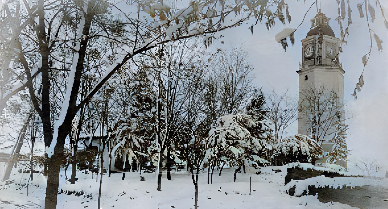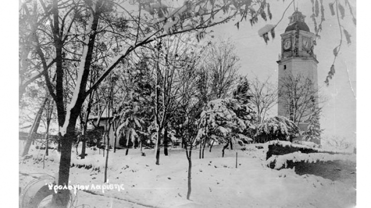 Η φωτογραφία του σημερινού επιστολικού δελταρίου έχει καταγραμμένες χειρόγραφα τις λέξεις: «Ωρολόγιον Λαρίσης». Η λήψη της έγινε μια χιονισμένη ημέρα. Δεξιά διακρίνεται η σιλουέτα του προπολεμικού ρολογιού και αριστερά το πάρκο με τα δένδρα που υπήρχε μπροστά του, εκεί όπου σήμερα βρίσκεται η πλατεία Μητέρας και ένα γειτονικό ψυχαγωγικό κέντρο που τους θερινούς μήνες αναπτύσσει τραπεζοκαθίσματα. Με την ευκαιρία που πρόσφατα είδαμε στο τοπικό τύπο τρία διαφορετικά σχέδια τού υπό σκέψιν να αναβιώσει ρολογιού της πόλης μας, θα αναφέρουμε λίγα λόγια για το ομορφότερο ρολόι που είχε μέχρι σήμερα η Λάρισα.