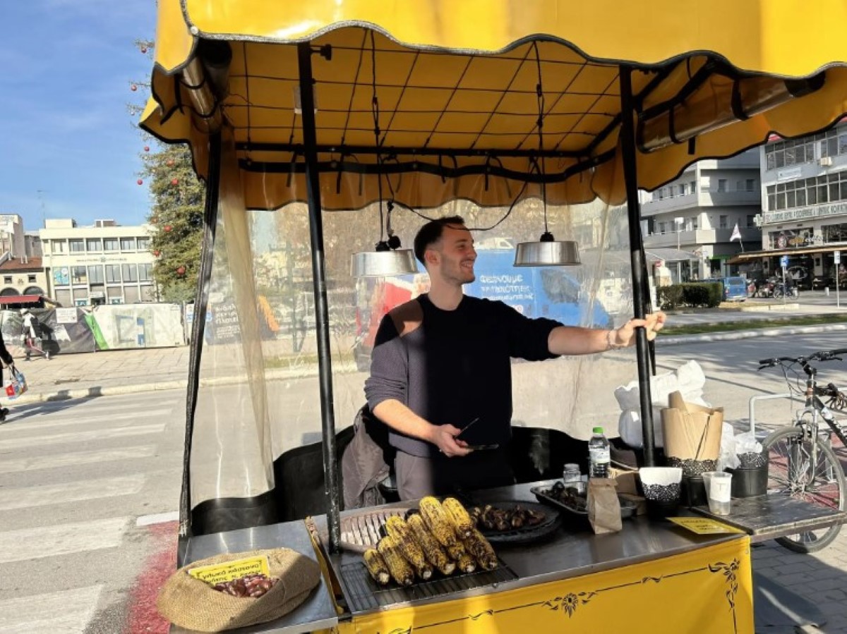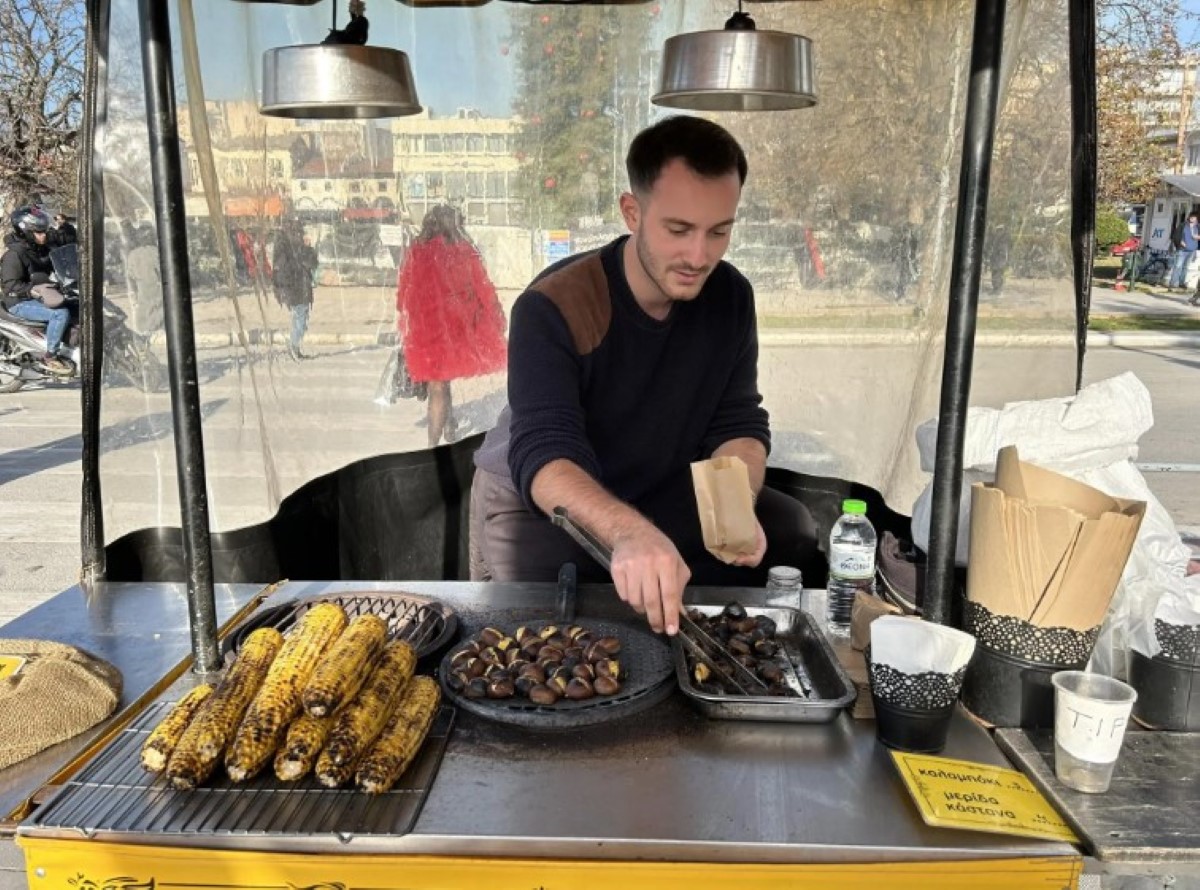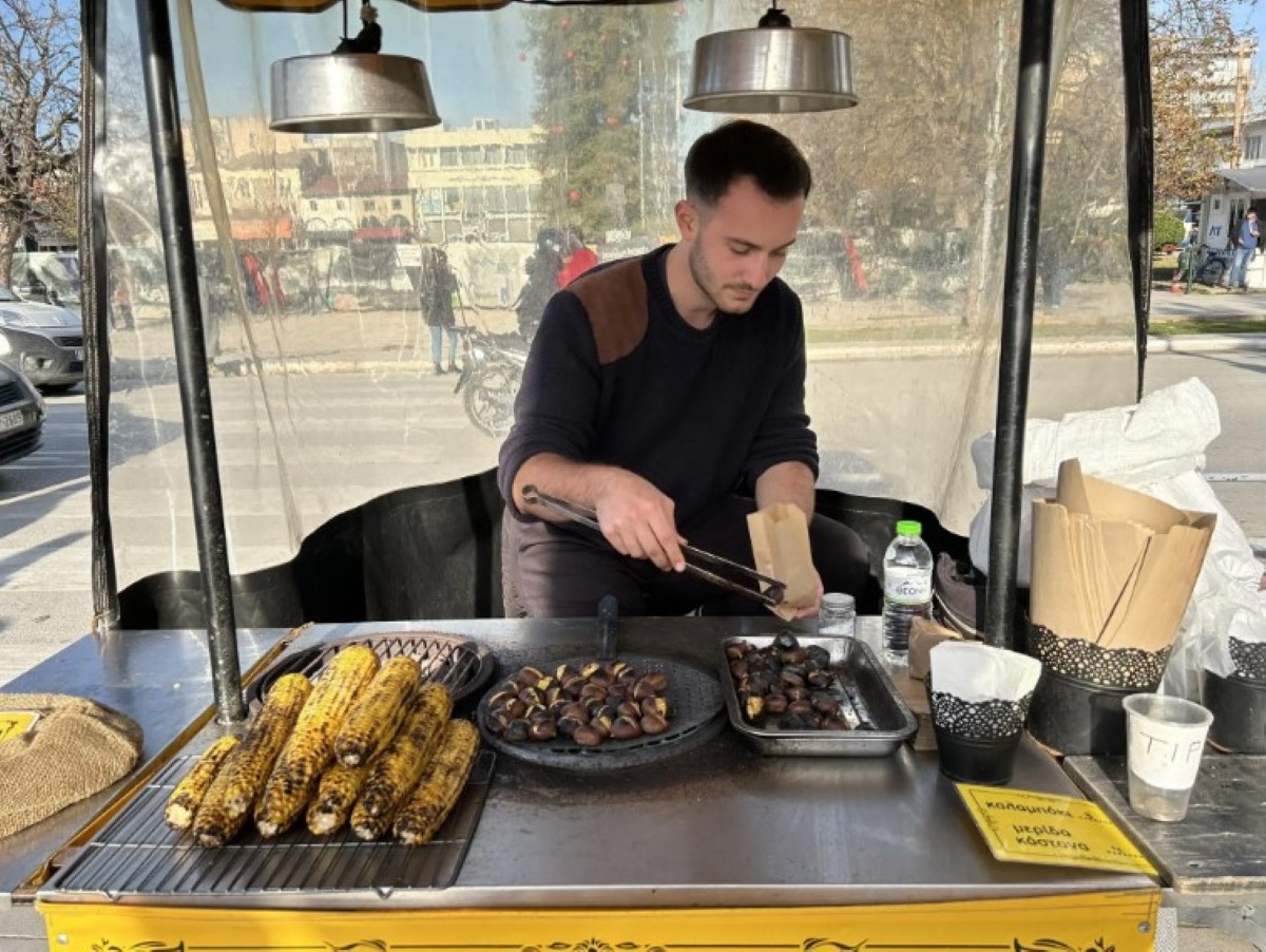 Συμπληρώνοντας απόλυτα, την εορταστική ατμόσφαιρα , ο 22χρονος, Βαγγέλης Ξάνθης ,φοιτητής του ΤΕΦΑΑ Τρικάλων με καταγωγή από την Πάτρα, παραμένει στη πόλη και κατά την διάρκεια των γιορτών πουλώντας ζεστά κάστανα και καλαμπόκι, στην κεντρική πλατεία των Τρικάλων.