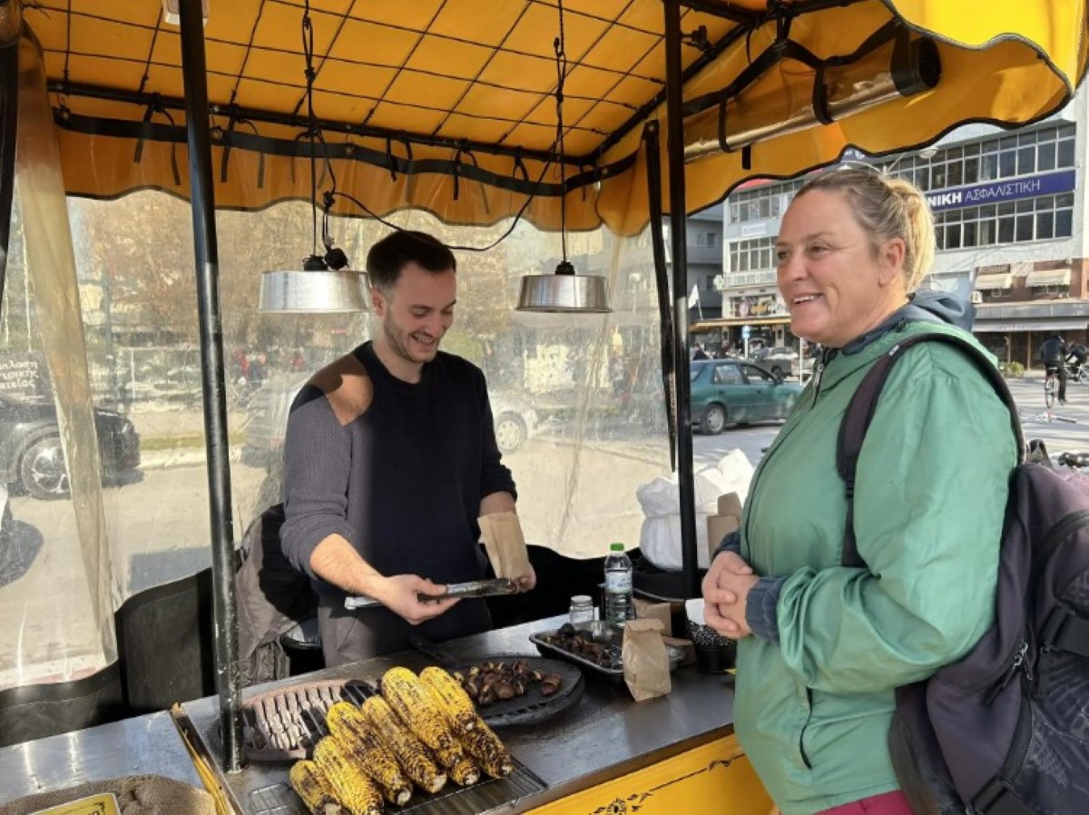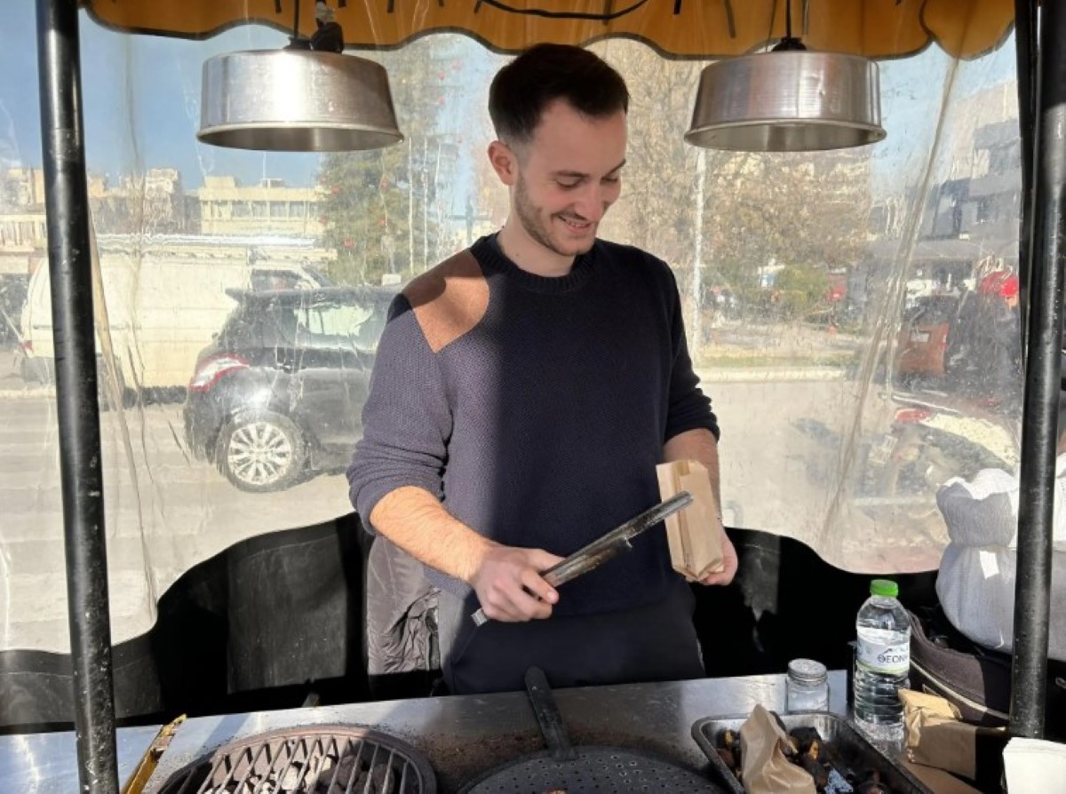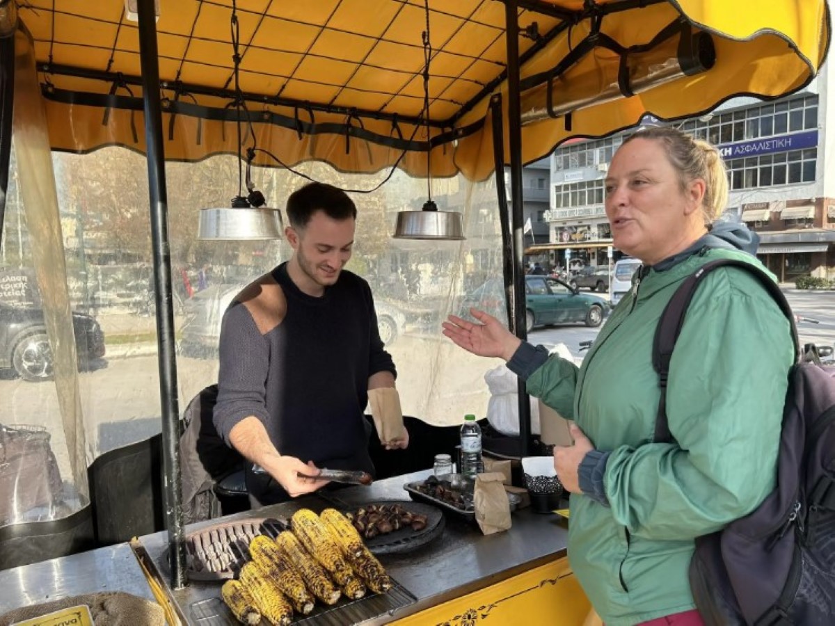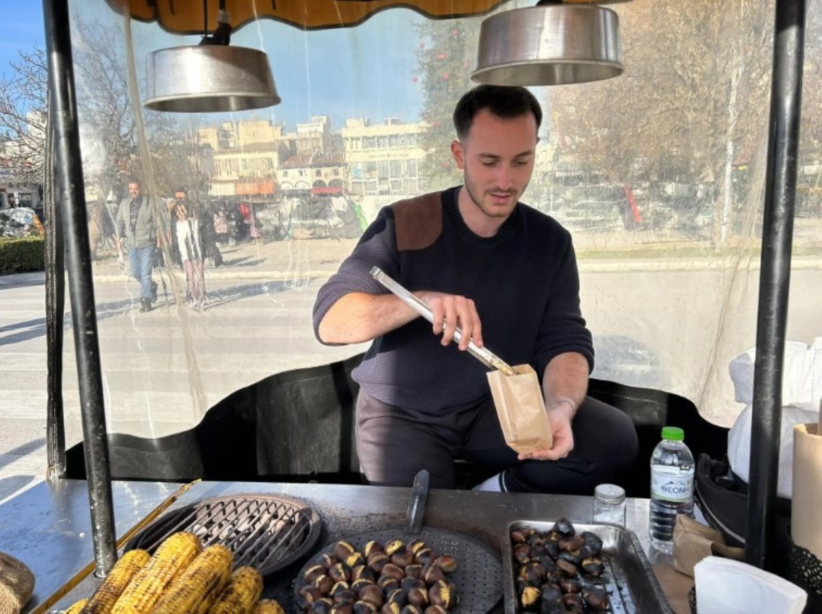 Συμπληρώνοντας απόλυτα, την εορταστική ατμόσφαιρα , ο 22χρονος, Βαγγέλης Ξάνθης ,φοιτητής του ΤΕΦΑΑ Τρικάλων με καταγωγή από την Πάτρα, παραμένει στη πόλη και κατά την διάρκεια των γιορτών πουλώντας ζεστά κάστανα και καλαμπόκι, στην κεντρική πλατεία των Τρικάλων.