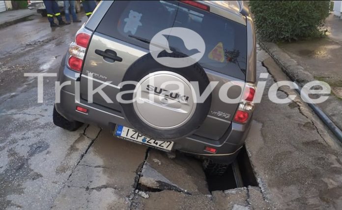 Όπως κατέγραψε το trikalavoice.gr λίγο μετά τις 7 π.μ. έσπασε αγωγός της ΔΕΥΑΤ που διέρχεται από τον συγκεκριμένο δρόμο, με αποτέλεσμα αυτός να ανοίξει στα δυο και να καταπιεί-κυριολεκτικά-διερχόμενο όχημα. Όπως φαίνεται και στις φωτογραφίες, αλλά και στα βίντεο του trikalavoice.gr το όχημα βούλιαξε μέσα στο άνοιγμα του δρόμου, έχοντας υποστεί σημαντικές υλικές ζημιές.