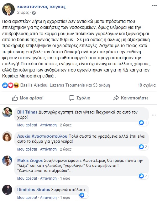 Όπως καταγράφει το trikalavoice.gr μετά τις χθεσινές ανακοινώσεις της ηγεσίας του Υπουργείου Υγείας ο Κώστας Τσίγκας, αυτόφωτος και δίχως εξαρτήσεις, βασικός και πρώτος υποστηρικτής του Κυριάκου Μητσοτάκη (στα Τρίκαλα) στις εσωκομματικές εκλογές αντέδρασε και εξέφρασε εν πολλοίς τη βάση τη παράταξης: