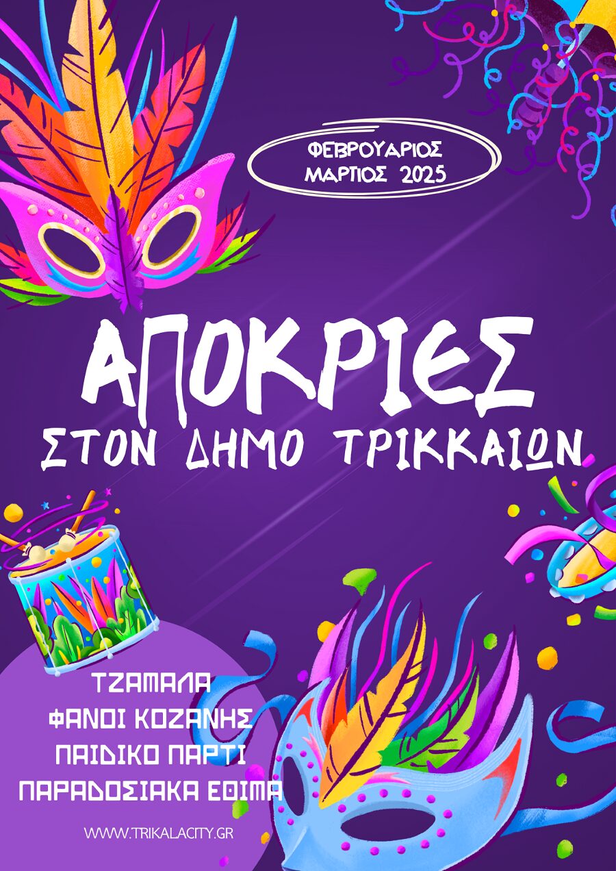 Σειρά εκδηλώσεων για την Αποκριά του 2025 διοργανώνει ο Δήμος Τρικκαίων. Με κέφι και τήρηση των εθίμων, με διάθεση να γιορτάσουν και να ξεφαντώσουν α παιδιά – και όχι μόνο! – προγραμματίστηκαν εκδηλώσεις στην πόλη και τα χωριά.