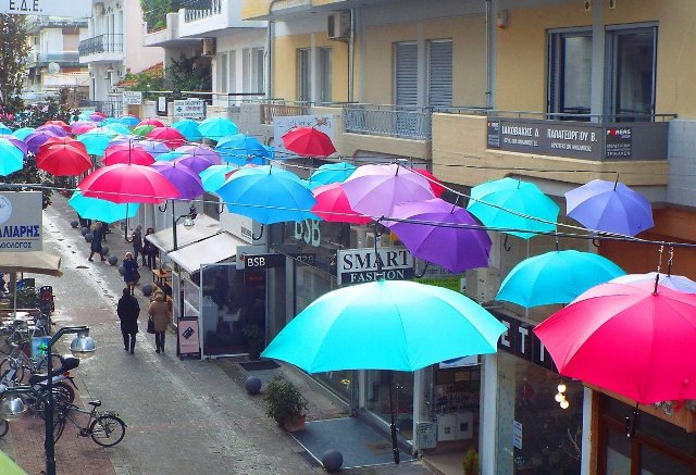 Χρώματα και εορταστικός στολισμός, βραδινές βόλτες, στον δρόμο για τον Μύλο των Ξωτικών, δίπλα στην καρδιά της εμπορικής κίνησης, σε απόσταση αναπνοής από τους χώρους διασκέδασης… Οι ομπρέλες δίνουν τον τόνο: χρώματα χαρά και ελπίδα, χαμόγελα και αισιοδοξία.