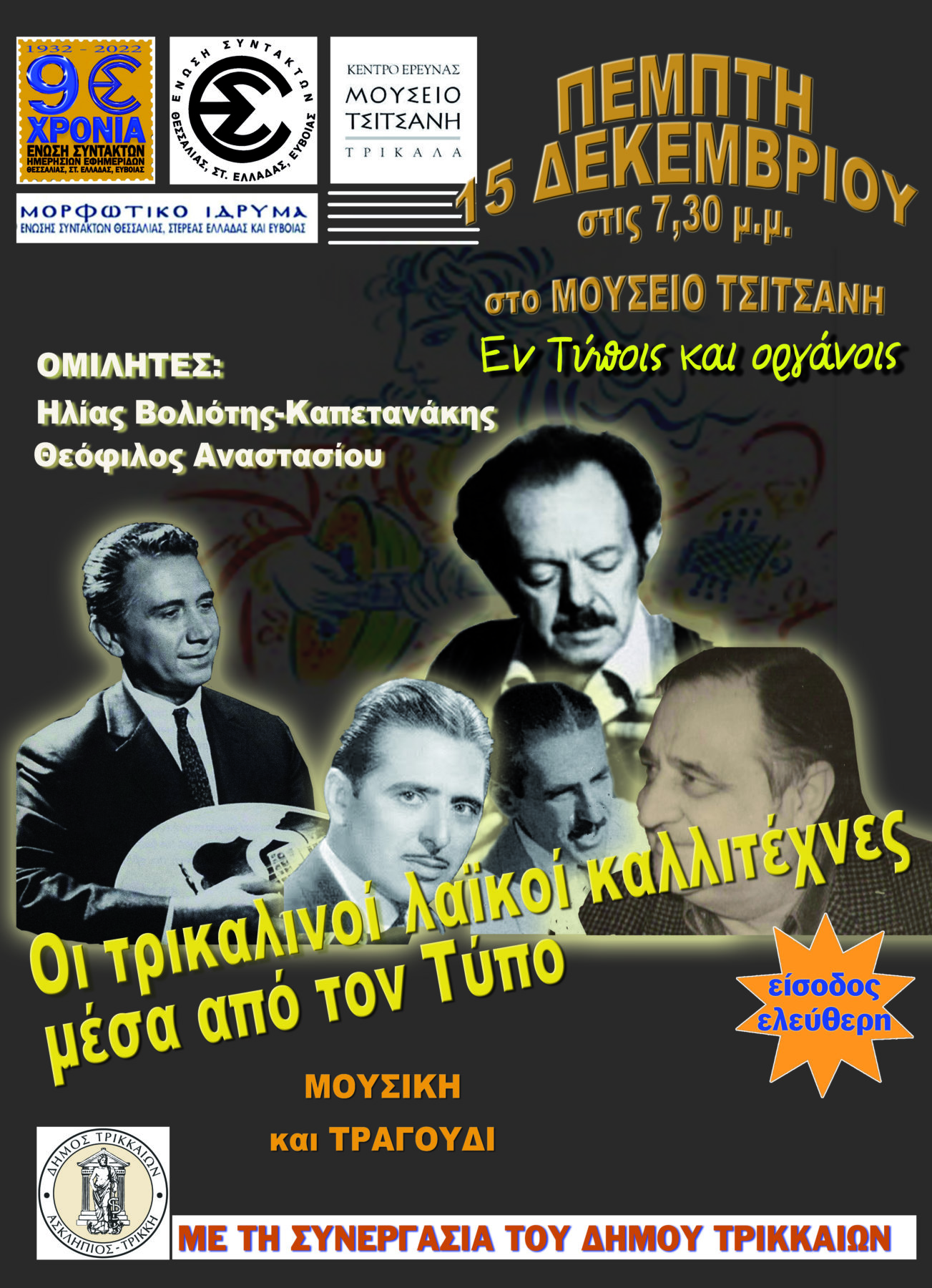 « Οι Τρικαλινοί λαϊκοί καλλιτέχνες μέσα από τον Τύπο». Αυτό είναι το θέμα της εκδήλωσης που διοργανώνει στα Τρίκαλα για τον γιορτασμό των 90 χρόνων από την ίδρυση της η Ένωση Συντακτών Θεσσαλίας, Στερεάς Ελλάδας και Εύβοιας, μαζί με το Μορφωτικό της Ίδρυμα και το Μουσείο Τσιτσάνη.