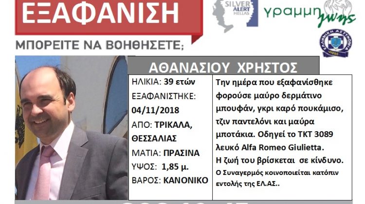 Σύμφωνα με την επίσημη ανάρτηση στη «γραμμή ζωής», ο 39χρονος Χρήστος Αθανασίου, ο οποίος εργαζόταν στη πόλη και ήταν ιδιαίτερα γνωστός στους εκκλησιαστικούς κύκλους, εξαφανίστηκε στις 4 του μηνός. Εκείνη την ημέρα φορούσε μαύρο δερμάτινο μπουφάν, γκρι καρό πουκάμισο, τζιν παντελόνι και μαύρα μποτάκια. Οδηγεί Alfa Romeo Gioulieta λευκό, με αριθμό κυκλοφορίας ΤΚΤ 3089. Η ζωή του βρίσκεται σε κίνδυνο και ο συναγερμός κοινοποιείται κατόπιν εντολής της ΕΛ.ΑΣ..