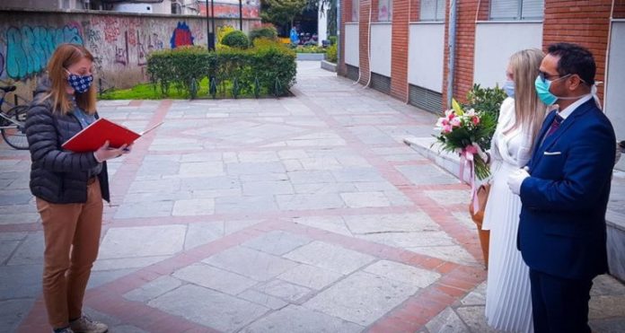 Το νεαρό Τρικαλινό ζευγάρι παντρεύτηκε με πολιτικό γάμο στον εξωτερικό χώρο του Δημαρχείου και μάλιστα με όλες τις απαραίτητες προφυλάξεις για τον κορονοϊό (μάσκες, γάντια κλπ.)