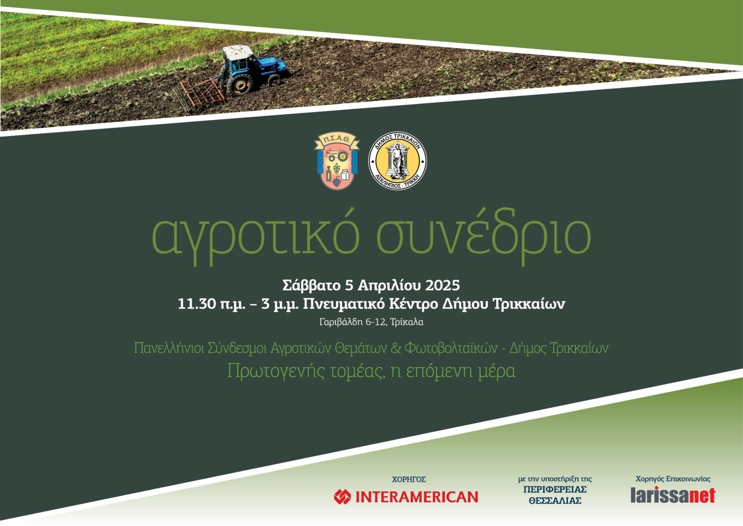 Ο Πανελλήνιος Σύνδεσμος Αγροτικών Θεμάτων (ΠΣΑΘ), ο Πανελλήνιος Σύνδεσμος Αγροτικών Φωτοβολταϊκών (ΠΣΑΦ) και ο Δήμος Τρικκαίων συνδιοργανώνουν το ετήσιο αγροτικό συνέδριό τους, σήμερα, Σάββατο 5 Απριλίου 2025 (11.30 π.μ. – 3 μ.μ.), στην αίθουσα του Πνευματικού Κέντρου του Δήμου Τρικκαίων (Γαριβάλδη 6-12, Τρίκαλα). Το συνέδριο με την υποστήριξη της Περιφέρειας Θεσσαλίας.