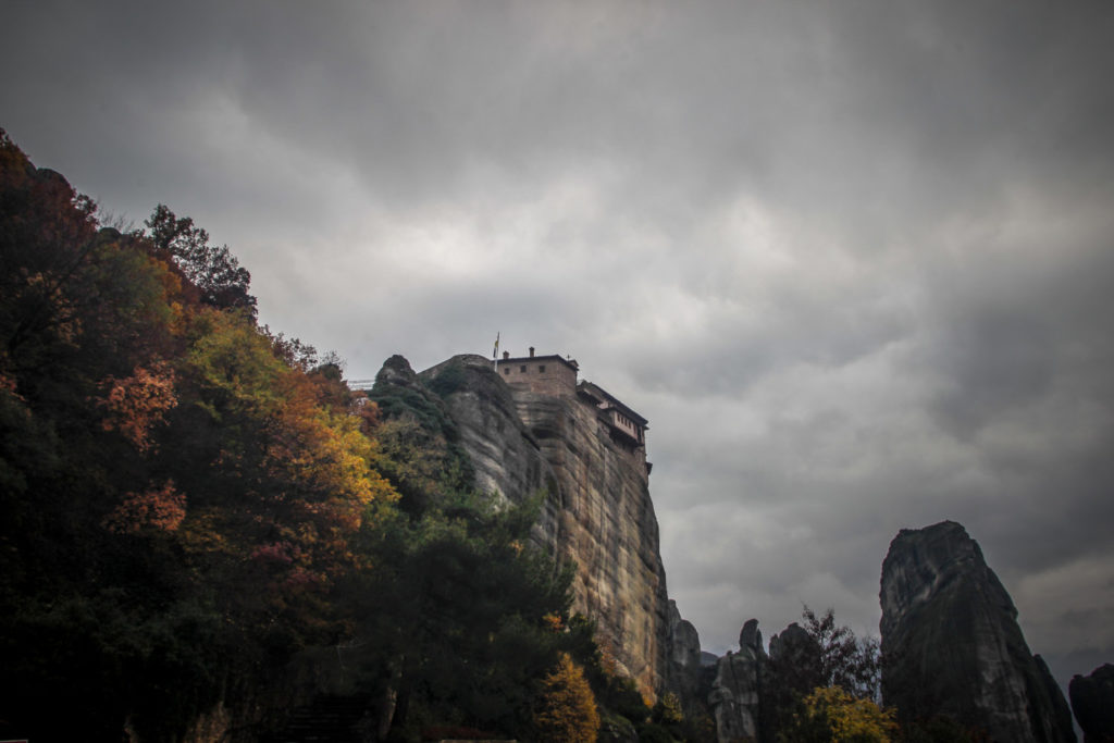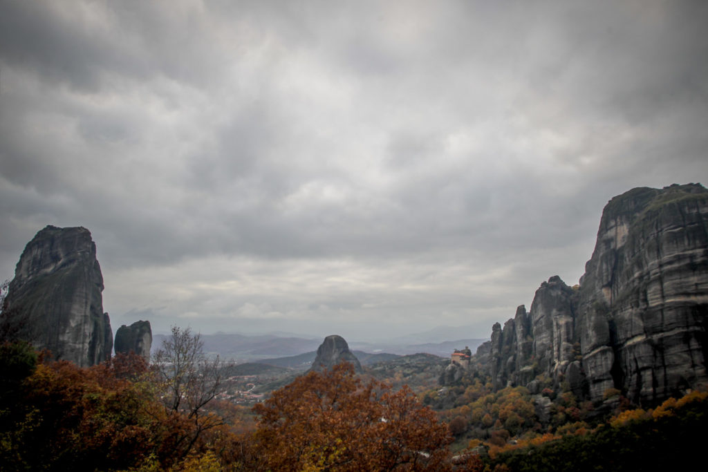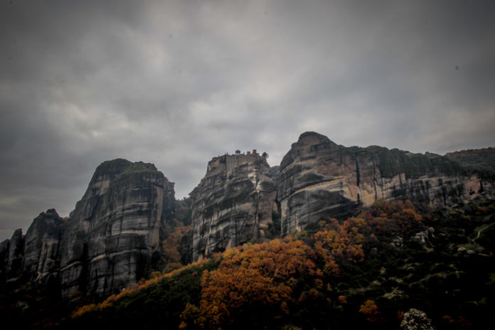 Οι βράχοι των Μετεώρων ξεπροβάλλουν στο χειμωνιάτικο τοπίο ανάμεσα στα καφεκίτρινα φύλλα των δέντρων. Το επιβλητικό βράχινο σύμπλεγμα από ψαμμίτη, η γέννηση των οποίων ξεκινά πριν από 25 εκατομμύρια χρόνια, αποτελεί έναν από τους δημοφιλής προορισμούς της Ελλάδας για εκατοντάδες χιλιάδες τουρίστες κάθε χρόνο.