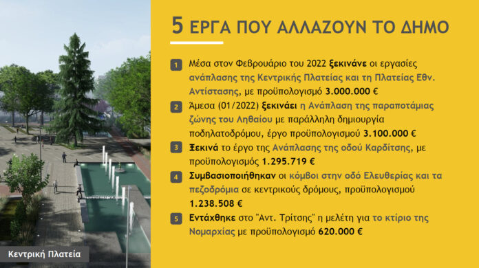 - Ανάπλαση Κεντρικής Πλατείας και Πλατείας Εθν. Αντίστασης. Προϋπολογισμός 3.000.000 € (Φεβρουάριος 2022)