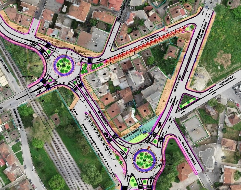 Β. Κατασκευάζεται κυκλικός κόμβος στην είσοδο του Σιδηροδρομικού Σταθμού (διασταύρωση των οδών Ασκληπιού, Ευριπίδου και Καβράκου