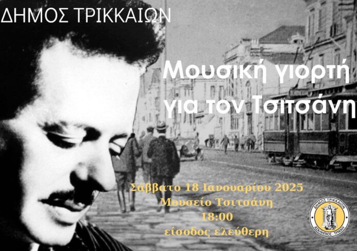 Στις 18:00 της 18ης Ιανουαρίου 2025, στην αίθουσα εκδηλώσεων του Μουσείου Τσιτσάνη, το Μουσικό Σύνολο του Δημοτικού Ωδείου Τρικάλων υπό τη διεύθυνση του Ανδρέα Τσέγα και η Δημοτική Χορωδία Τρικάλων «Voci Intonate» υπό την διεύθυνση της Ελένης Ζιάκα, θα μας ταξιδέψουν στον κόσμο των μοναδικών μελωδιών του μεγάλου τρικαλινού συνθέτη.