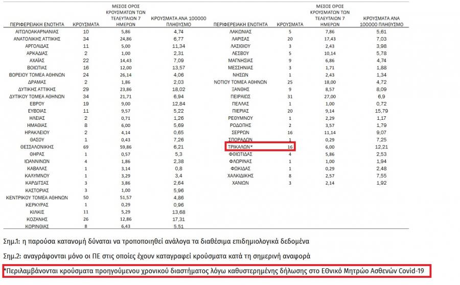 Συγκεκριμένα όπως βλέπουμε στη σχετική ανακοίνωση, στην περιφερειακή ενότητα Τρικάλων εντοπίστηκαν 16 κρούσματα, αλλά εάν κοιτάξουμε λίγο πιο προσεκτικά υπάρχει αστερίσκος σύμφωνα με τον οποίο «περιλαμβάνονται κρούσματα προηγούμενου διαστήματος λόγω καθυστερημένης δήλωσης στο Εθνικό Μητρώο ασθενών covid-19».