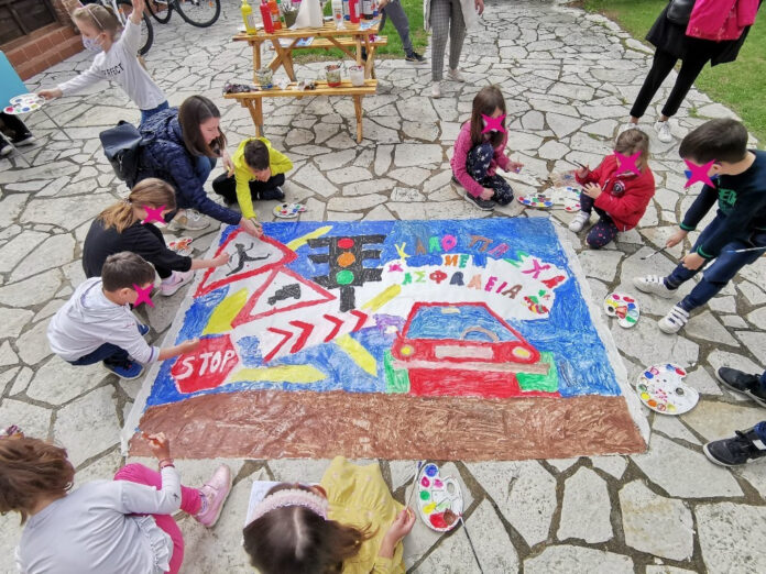 Το πρωί της Μ. Τετάρτης 20 Απριλίου 2022 στον προαύλιο χώρο του Εργαστηρίου, στον πανέμορφο και ανοιξιάτικο μύλο Ματσόπουλου, τα παιδιά ζωγράφισαν ένα μικρό πανό με προτροπή για την τήρηση των μέτρων που επιφέρουν οδική ασφάλεια.